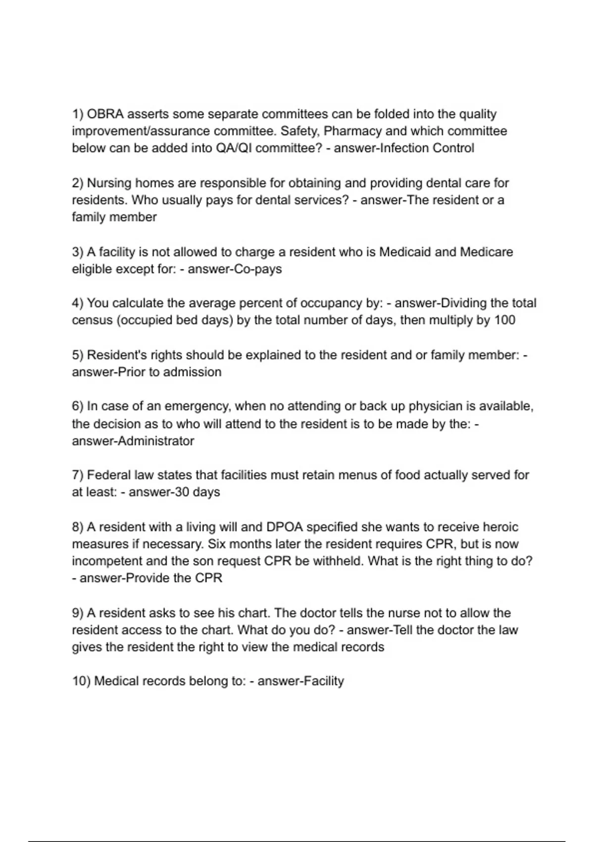 1) OBRA asserts some separate committees can be folded into the quality improvement/assurance committee. Safety, Pharmacy and which committee below can be added into QA/QI committee? - answer-Infection Control 2) Nursing homes are responsible for obtaining and providing dental care for residents. Who usually pays for dental services? - answer-The resident or a family member 3) A facility is not allowed to charge a resident who is Medicaid and Medicare eligible except for: - answer-Co-pays 4) You calculate the average percent of occupancy by: - answer-Dividing the total census (occupied bed days) by the total number of days, then multiply by 100 5) Resident's rights should be explained to the resident and or family member: - answer-Prior to admission 6) In case of an emergency, when no attending or back up physician is available, the decision as to who will attend to the resident is to be made by the: - answer-Administrator 7) Federal law states that facilities must retain menus of food actually served for at least: - answer-30 days 8) A resident with a living will and DPOA specified she wants to receive heroic measures if necessary. Six months later the resident requires CPR, but is now incompetent and the son request CPR be withheld. What is the right thing to do? - answer-Provide the CPR 9) A resident asks to see his chart. The doctor tells the nurse not to allow the resident access to the chart. What do you do? - answer-Tell the doctor the law gives the resident the right to view the medical records 10) Medical records belong to