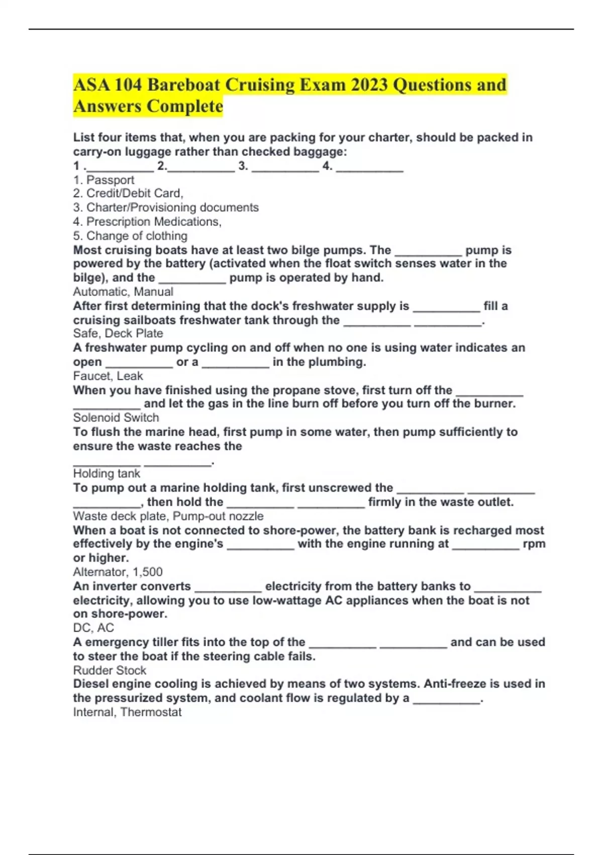 ASA 104 Bareboat Cruising Exam 2023 Questions and Answers Complete List four items that, when you are packing for your charter, should be packed in carry-on luggage rather than checked baggage: 1 .__________ 2.__________ 3. __________ 4. __________ 1. Passport 2. Credit/Debit Card, 3. Charter/Provisioning documents 4. Prescription Medications, 5. Change of clothing Most cruising boats have at least two bilge pumps. The __________ pump is powered by the battery (activated when the float switch senses water in the bilge), and the __________ pump is operated by hand. Automatic, Manual After first determining that the dock's freshwater supply is __________ fill a cruising sailboats freshwater tank through the __________ __________. Safe, Deck Plate A freshwater pump cycling on and off when no one is using water indicates an open __________ or a __________ in the plumbing. Faucet, Leak When you have finished using the propane stove, first turn off the __________ __________ and let the gas in the line burn off before you turn off the burner. Solenoid Switch To flush the marine head, first pump in some water, then pump sufficiently to ensure the waste reaches the __________ __________. Holding tank To pump out a marine holding tank, first unscrewed the __________ __________ __________, then hold the __________ __________ firmly in the waste outlet. Waste deck plate, Pump-out nozzle When a boat is not connected to shore-power, the battery bank is recharged most effectively by the engine's __________ with the engine running at __________ rpm or higher. Alternator, 1,500 An inverter converts __________ electricity from the battery banks to __________ electricity, allowing you to use low-wattage AC appliances when the boat is not on shore-power. DC, AC A emergency tiller fits into the top of the __________ __________ and can be used to steer the boat if the steering cable fails. Rudder Stock Diesel engine cooling is achieved by means of two systems. Anti-freeze is used in the pressurized system, and coolant flow is regulated by a __________. Internal, Thermostat The engine driven __________ - __________ pump circulates seawater in the engines raw-water cooling system. The pump's __________ is an important spare part to have on board. Raw-Water, Impeller List four factors that effect a sailing vessel's range under power: 1. __________ 2. __________ 3. __________ 4. __________ 1. Tank Capacity 2. Engine RPM 3. Wind and Waves 4. Current