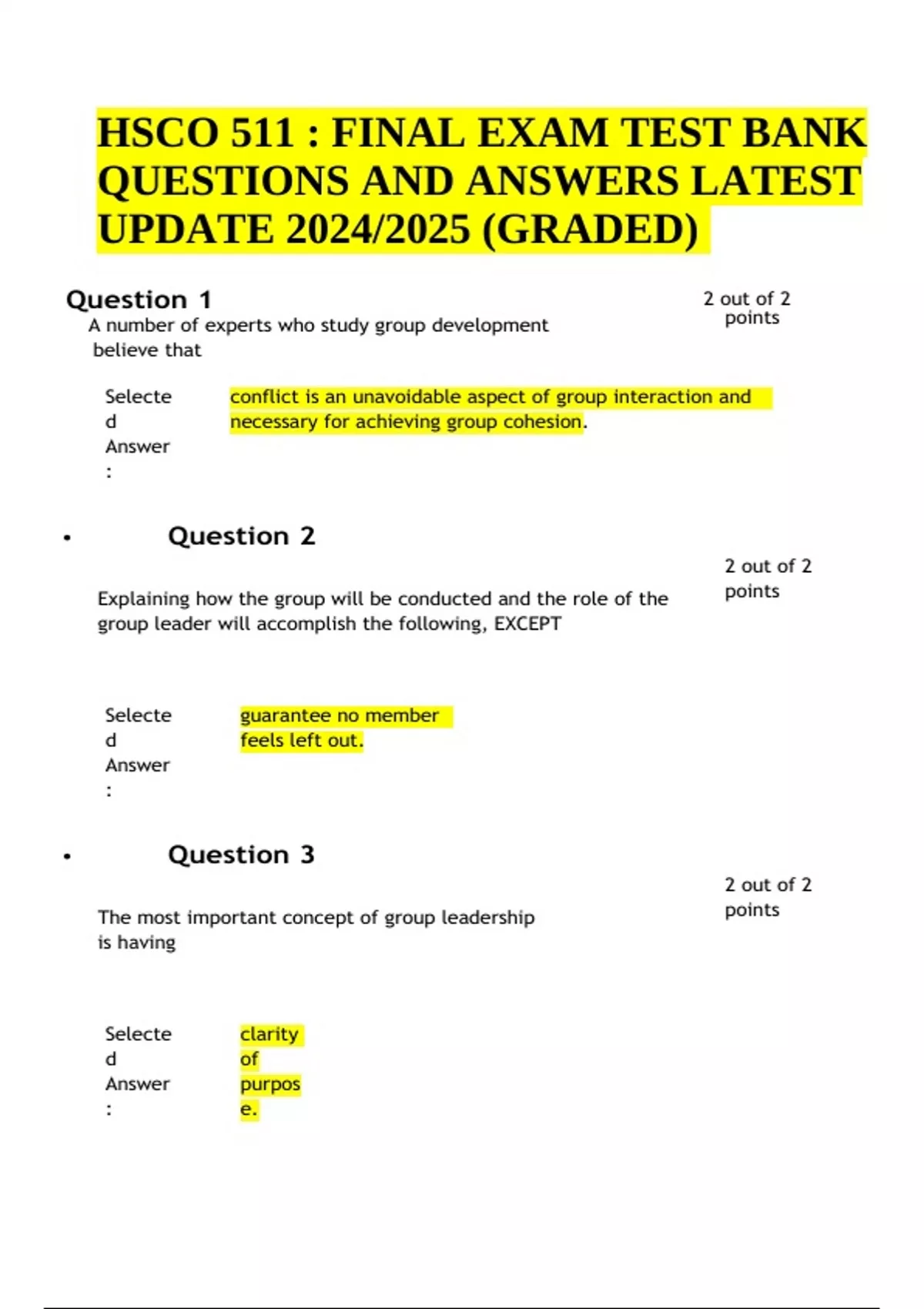 HSCO 511 : FINAL EXAM TEST BANK QUESTIONS AND ANSWERS LATEST UPDATE 2024/2025 (GRADED) A number of experts who study group development believe that 2 out of 2 points Selecte d Answer : conflict is an unavoidable aspect of group interaction and necessary for achieving group cohesion. • Question 2 Explaining how the group will be conducted and the role of the group leader will accomplish the following, EXCEPT 2 out of 2 points Selecte d Answer : guarantee no member feels left out. • Question 3 The most important concept of group leadership is having 2 out of 2 points Selecte d Answer : clarity of purpos e. HSCO 511 : FINAL EXAM TEST BANK QUESTIONS AND ANSWERS LATEST UPDATE 2024/2025 (GRADED) • Question 4 Donald decides that he wants to do more for the group. He starts helping other members by taking on some of their work and organizing fund raisers. Donald is providing support. 2 out of 2 points Selecte d Answer : instrumen t al • Question 5 Which one is task-focused rather than relationship-focused? 2 out of 2 points Selecte d Answer : Offering a good solution to a problem the group faces • Question 6 If the leader sees that a change of purpose is needed, he or she should 2 out of 2 points Selecte d Answer : discuss with the group why the change might be helpful. • Questio n Which of the following is NOT associated with “second session let down?” Selecte d Answer : Disagreement about the group norms • Question 8 Which of the following does NOT characterize an advantage of group work? 2 out of 2 points Selecte d Answer : Making those reluctant to self-disclose doing so by applying group pressure • Questio n 9 2 out of 2 points Which of the following is NOT one of Jacobs et al.’s perspectives on the relationship between content and process in a group meeting? Selecte d Answer : Content refers to the dynamics and therapeutic forces in the group whereas process refers to the purpose and task of the group. • Question 10 Sherif’s study of the autokinetic effect indicated that group norms 2 out of 2 points Selecte d Answer : emerge as members reach a consensus through reciprocal influence. • Question 11 Which exercise is NOT appropriate to use in the first session of a group? 2 out of 2 points Selecte d Answer : Fant as y • Question 12 Interdependence, a key quality of groups, requires 2 out of 2 points Selecte d Answer : members’ outcomes depend, in part, on the actions of others in the group. • Question 13 All of the following are appropriate ways to begin a session EXCEPT: 2 out of 2 points Selecte d Answer: Conductinga30-45minutewarm-upactivit y • Question 14 2 out of 2 points While other models typically include four or more group stages, Jacobs et al. propose three stages. In which stage do members benefit the most from being in the group? Selecte d Answer : Middle or Workin g interch an ge • Question 16 2 out of 2 points In a social skills group for children, the leader uses exercises to help members learn skills to improve peer relationships. Which leadership style is being utilized? Selecte d Answer : Leader directed and interpersonal • Question 17 2 out of 2 points According to Jacobs et al., which of the following can be a MISTAKE with regard to group rules? Selecte d Answer : M a king up the rules as a group decision activity • Question 18 2 out of 2 points If there are group members who are not clear about the group’s purpose, the following is recommended, EXCEPT Selecte d Answer : asking those members to leave the group. • Question 19 2 out of 2 points Audiences, bystanders and crowds are while coworkers, sports teams, and study groups are . Selecte d Answer : collectives; social groups • Question 20 Most roles fit into one of two broad categories: roles and roles. 2 out of 2 points Selecte d Answer : relationshi p; task • Question 21 2 out of 2 points In the middle stage of a support group for step-parents, the members decided to focus on their individual concerns in a written exercise. Which leadership style is being utilized? Selecte d Answer : Group directed and intrapersonal • Question 22 2 out of 2 points This theory assumes that how secure and comfortable you were with your primary caregiver influences your relationships, including group memberships, throughout your entire life. Selecte d Answer : Attach me nt • Question 23 A multicomponent approach to cohesion assumes 2 out of 2 points Selecte d Answer : there are many different factors that contribute to group cohesion. • Question 24 When planning a session, the following is recommended, EXCEPT: 2 out of 2 points Selecte d Answer : Spending very little time planning the sessions if the group is in the beginning stage • Question 25 2 out of 2 points According to Jacobs et al., the single most important therapeutic force of a group is the Selecte d Answer : clarity of purpos e. • Question 26 Which of the following is FALSE about the purpose of a group?