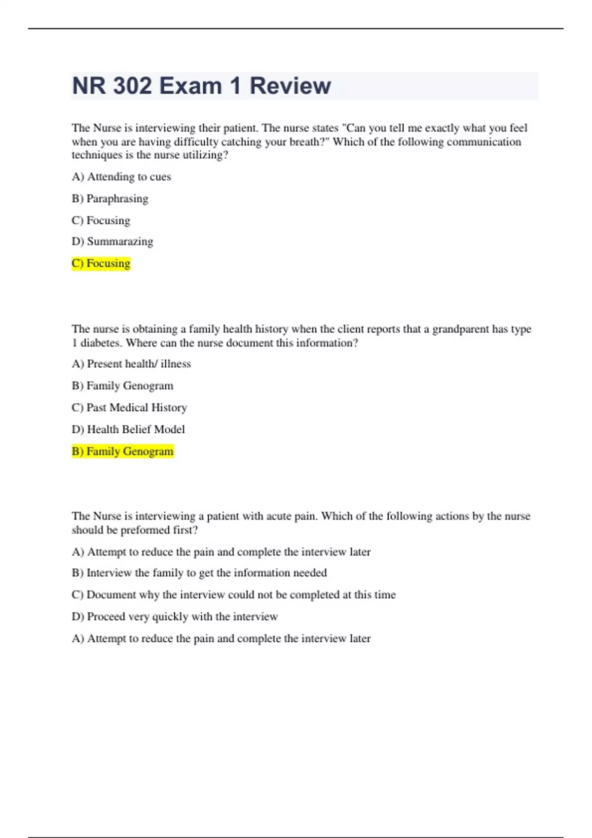 NR 302 EXAM 1 REVIEW QUESTIONS WITH 100% SOLVED SOLUTIONSThe Nurse is interviewing their patient. The nurse states "Can you tell me exactly what you feel when you are having difficulty catching your breath?" Which of the following communication techniques is the nurse utilizing? A) Attending to cues B) Paraphrasing C) Focusing D) Summarazing C) Focusing The nurse is obtaining a family health history when the client reports that a grandparent has type 1 diabetes. Where can the nurse document this information? A) Present health/ illness B) Family Genogram C) Past Medical History D) Health Belief Model B) Family Genogram The Nurse is interviewing a patient with acute pain. Which of the following actions by the nurse should be preformed first? A) Attempt to reduce the pain and complete the interview later B) Interview the family to get the information needed C) Document why the interview could not be completed at this time D) Proceed very quickly with the interview A) Attempt to reduce the pain and complete the interview later The nurse is interviewing her patient. The nurse says to the client "It sounds like you do not like your new job because it is more stressful than you anticipated." Which of the following types of communication is the nurse utilizing? A) Questioning B) Paraphrasing C) Attending D) Listening B) Paraphrasing In an interview, the nurse may find it necessary to take notes to aid his or her memory later. Which statement is true regarding note-taking? A) Note-taking may impede the nurse's observation of the patient's nonverbal behaviors. B) Note-taking allows the patient to continue at his or her own pace as the nurse records what is said. C) Note-taking allows the nurse to shift attention away from the patient, resulting in an increased comfort level. D) Note-taking allows the nurse to break eye contact with the patient, which may increase his or her level of comfort. A) Note-taking may impede the nurse's observation of the patient's nonverbal behaviors. Page: 31 Some use of history forms and note-taking may be unavoidable. But be aware that note-taking during the interview has disadvantages. It breaks eye contact too often, and it shifts attention away from the patient, which diminishes his or her sense of importance. It also may interrupt the patient's narrative flow, and it impedes the observation of the patient's nonverbal behavior. During an interview, the nurse states, "You mentioned shortness of breath. Tell me more about that." Which verbal skill is used with this