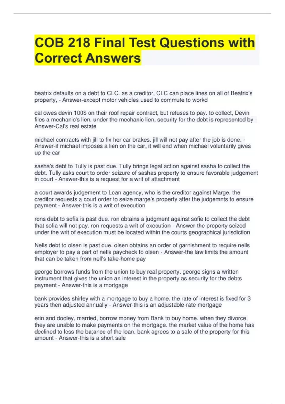 COB 218 Final Test Questions with Correct Answers beatrix defaults on a debt to CLC. as a creditor, CLC can place lines on all of Beatrix's property, - Answer-except motor vehicles used to commute to workd cal owes devin 100$ on their roof repair contract, but refuses to pay. to collect, Devin files a mechanic's lien. under the mechanic lien, security for the debt is represented by - Answer-Cal's real estate michael contracts with jill to fix her car brakes. jill will not pay after the job is done. - Answer-if michael imposes a lien on the car, it will end when michael voluntarily gives up the car sasha's debt to Tully is past due. Tully brings legal action against sasha to collect the debt. Tully asks court to order seizure of sashas property to ensure favorable judgement in court - Answer-this is a request for a writ of attachment a court awards judgement to Loan agency, who is the creditor against Marge. the creditor requests a court order to seize marge's property after the judgemnts to ensure payment - Answer-this is a writ of execution rons debt to sofia is past due. ron obtains a judgment against sofie to collect the debt that sofia will not pay. ron requests a writ of execution - Answer-the property seized under the writ of execution must be located within the courts geographical jurisdiction Nells debt to olsen is past due. olsen obtains an order of garnishment to require nells employer to pay a part of nells paycheck to olsen - Answer-the law limits the amount that can be taken from nell's take-home pay george borrows funds from the union to buy real property. george signs a written instrument that gives the union an interest in the property as security for the debts payment - Answer-this is a mortgage bank provides shirley with a mortgage to buy a home. the rate of interest is fixed for 3 years then adjusted annually - Answer-this is an adjustable-rate mortgage erin and dooley, married, borrow money from Bank to buy home. when they divorce, they are unable to make payments on the mortgage. the market value of the home has declined to less the ba;ance of the loan. bank agrees to a sale of the property for this amount - Answer-this is a short sale vito borrows money form bank to buy a home. if he fails to make payments on the mortgage, the bank has the right to repossess and auction off the property securing the loan - Answer-this is a foreclosure gena borrows money from bank to buy a home, which secures the mortgage. in the 7th years of the loan, gena stops making payments. after the bank repossesses the house but before it is sold, gena may bur it by paying - Answer-the full amount of the debt, plus any interests and costs denise borrows money from the credit union to buy a home. denise loses her job and fails to make a payment, but promises the union that she will get another job. the union agrees to postpone the payments - Answer-this is a forebearence trucking LLC buys a white van from Motors inc, on credit under a guarantee signed by herbie, the Trucking president, mkaing him personally liable if the company does not pay - Answer-herbie is a guarantor dina asks eddie to co-sign a credit application so that she can borrow money. if, after the loan agreement is signed, dina agrees to a higher interest rate wihtout telling eddie, - Answer-eddie is discharged form the agreement jordan is a surety for kelly's loan from lenders credit. when the loan comes due, kelly tries to pay, but they reject her payment. - Answer-jordan is released from any obligations on the debt nancy joins with other creditors to force odette into bankruptcy. one goal of bankruptcy law with respect to creditors, is to - Answer-ensure equitable treatment of creditors who are competing for debtors assets jim wishes to appeal a decision of a bankruptcy in a court - Answer-jim may appeal to a federal district court charise files a petition in bankruptcy in a liquidation proceeding. if the court administers the means test and conlcudes that charise is abusing the bankruptcy process by filing for a liquidation, most likely - Answer-charise will be forced to file for relif throuhg an individual repayment plan