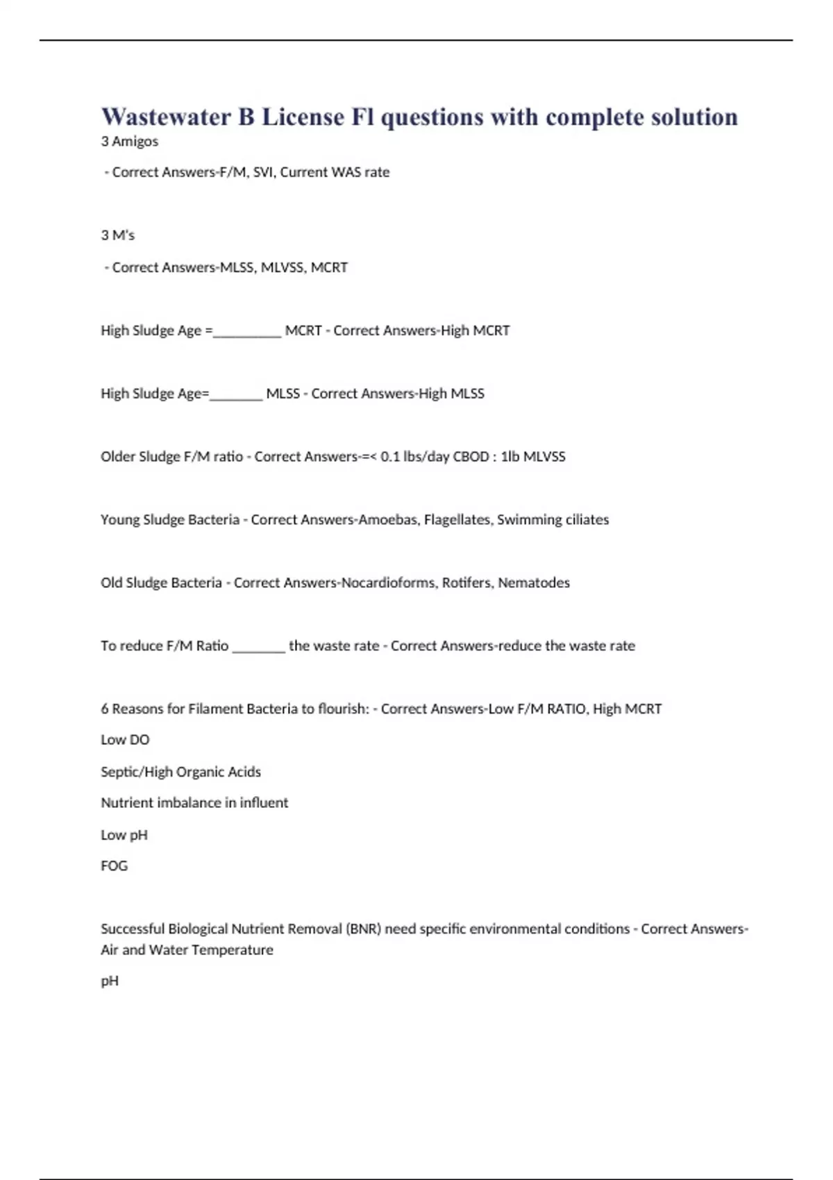 Wastewater B License Fl questions with complete solution 3 Amigos - Correct Answers-F/M, SVI, Current WAS rate 3 M's - Correct Answers-MLSS, MLVSS, MCRT High Sludge Age =_________ MCRT - Correct Answers-High MCRT High Sludge Age=_______ MLSS - Correct Answers-High MLSS Older Sludge F/M ratio - Correct Answers-= 0.1 lbs/day CBOD : 1lb MLVSS Young Sludge Bacteria - Correct Answers-Amoebas, Flagellates, Swimming ciliates Old Sludge Bacteria - Correct Answers-Nocardioforms, Rotifers, Nematodes To reduce F/M Ratio _______ the waste rate - Correct Answers-reduce the waste rate 6 Reasons for Filament Bacteria to flourish: - Correct Answers-Low F/M RATIO, High MCRT Low DO Septic/High Organic Acids Nutrient imbalance in influent Low pH FOG Successful Biological Nutrient Removal (BNR) need specific environmental conditions - Correct Answers-Air and Water Temperature pH Alkalinity Nutrients MCRT/SRT Proper respiratory conditions