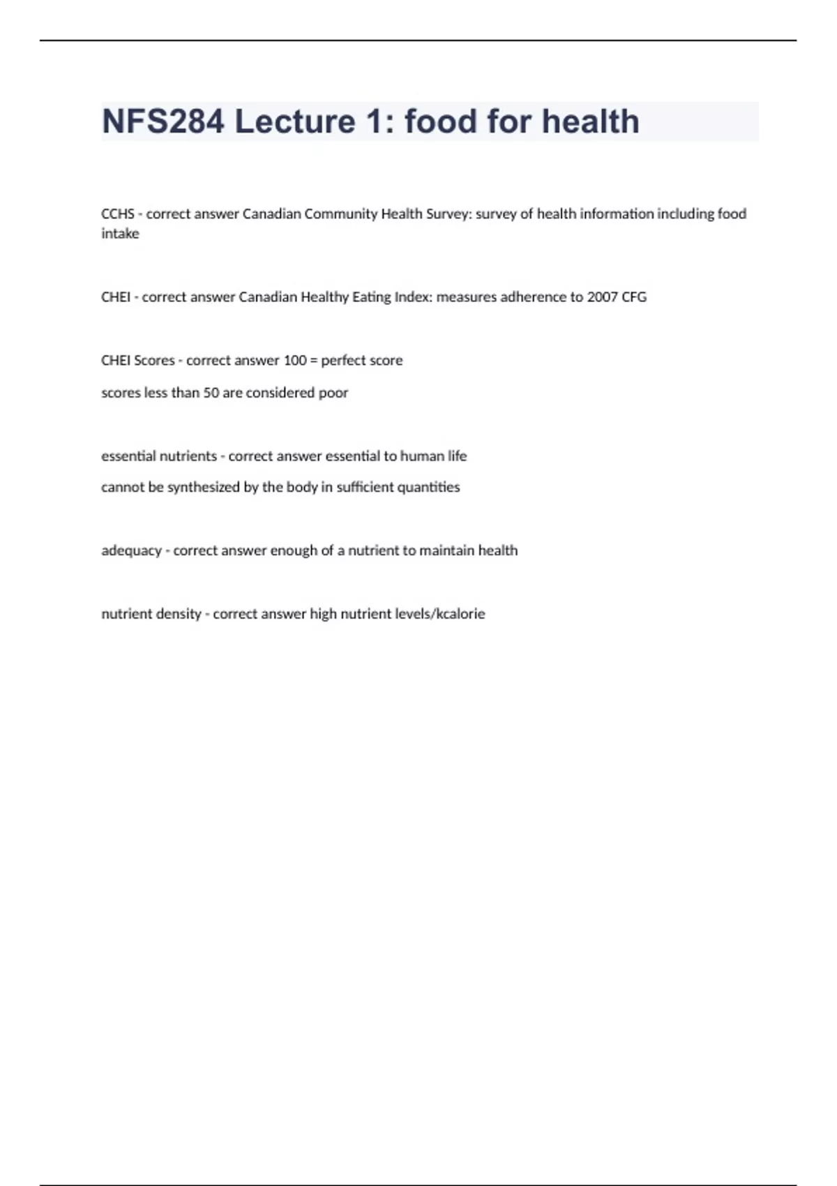 NFS284 Lecture 1 food for health Question and answers 100% correct 2024 CCHS - correct answer Canadian Community Health Survey: survey of health information including food intake CHEI - correct answer Canadian Healthy Eating Index: measures adherence to 2007 CFG CHEI Scores - correct answer 100 = perfect score scores less than 50 are considered poor essential nutrients - correct answer essential to human life cannot be synthesized by the body in sufficient quantities adequacy - correct answer enough of a nutrient to maintain health nutrient density - cor