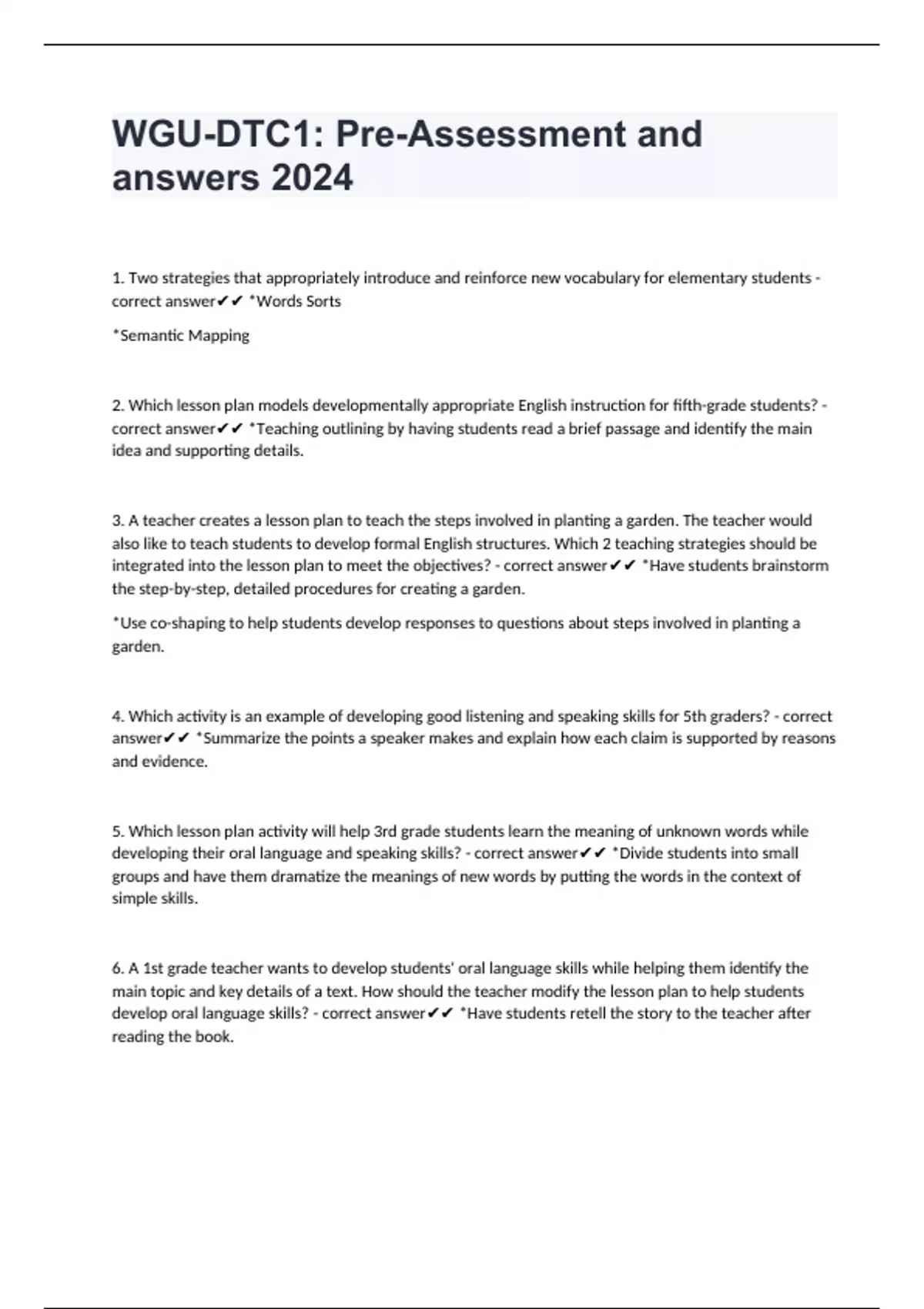 1. Two strategies that appropriately introduce and reinforce new vocabulary for elementary students - correct answer *Words Sorts *Semantic Mapping 2. Which lesson plan models developmentally appropriate English instruction for fifth-grade students? - correct answer *Teaching outlining by having students read a brief passage and identify the main idea and supporting details. 3. A teacher creates a lesson plan to teach the steps involved in planting a garden. The teacher would also like to teach students to develop formal English structures. Which 2 teaching strategies should be integrated into the lesson plan to meet the objectives? - correct answer *Have students brainstorm the step-by-step, detailed procedures for creating a garden. *Use co-shaping to help students develop responses to questions about steps involved in planting a garden. 4. Which activity is an example of developing good listening and speaking skills for 5th graders? - correct answer *Summarize the points a speaker makes and explain how each claim is supported by reasons and evidence.