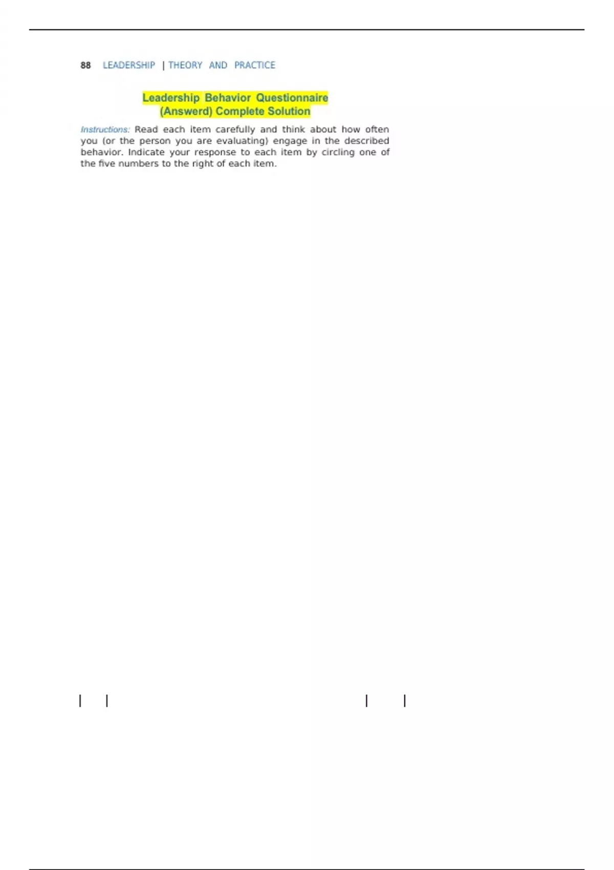 88 LEADERSHIP THEORY AND PRACTICE Leadership Behavior Questionnaire (Answerd) Complete Solution Instructions: Read each item carefully and think about how often you (or the person you are evaluating) engage in the described behavior. Indicate your response to each item by circling one of the five numbers to the right of each item. This study so