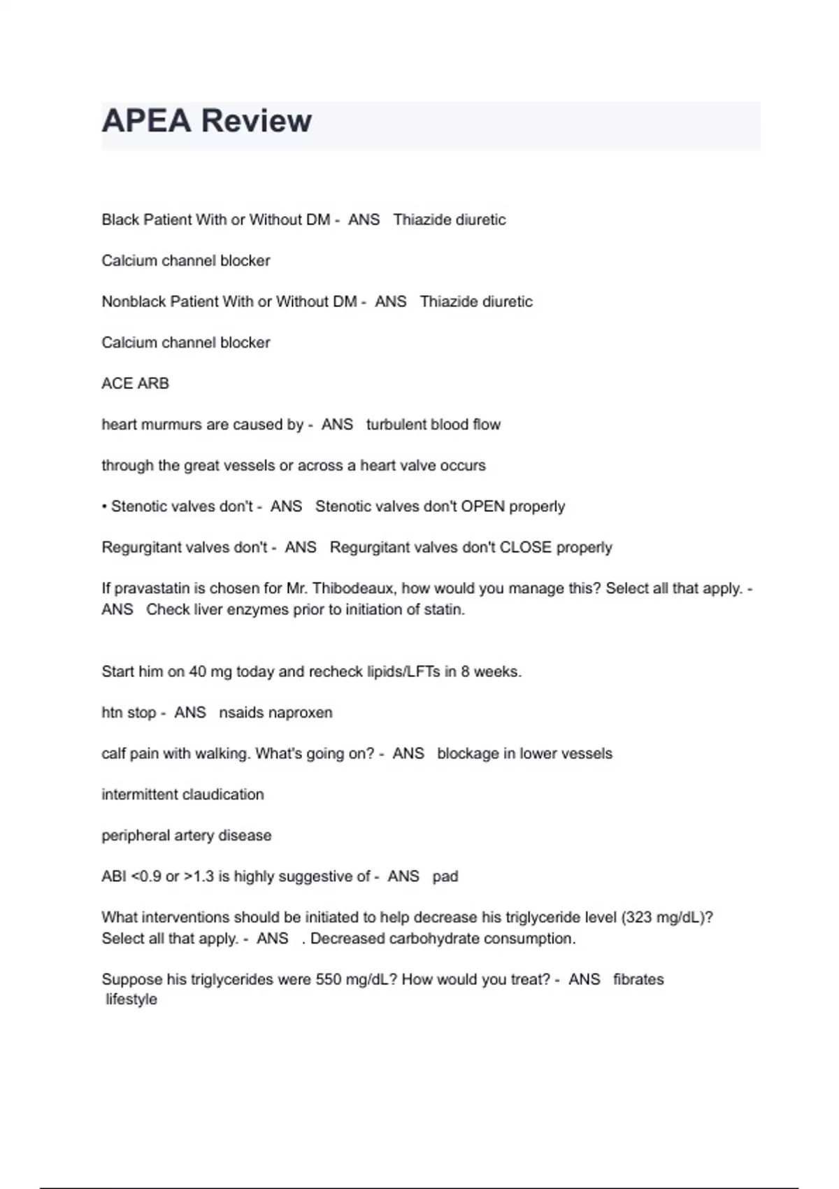 APEA Review Exam Questions And Answers Black Patient With or Without DM - ANS Thiazide diuretic Calcium channel blocker Nonblack Patient With or Without DM - ANS Thiazide diuretic Calcium channel blocker ACE ARB heart murmurs are caused by - ANS turbulent blood flow through the great vessels or across a heart valve occurs • Stenotic valves don't - ANS Stenotic valves don't OPEN properly Regurgitant valves don't - ANS Regurgitant valves don't CLOSE properly If pravastatin is chosen for Mr. Thibodeaux, how would you manage this? Select all that apply. - ANS Check liver enzymes prior to initiation of statin. Start him on 40 mg today and recheck lipids/LFTs in 8 weeks. htn stop - ANS nsaids naproxen calf pain with walking. What's going on? - ANS blockage in lower vessels intermittent claudication peripheral artery disease ABI <0.9 or >1.3 is highly suggestive of - ANS pad