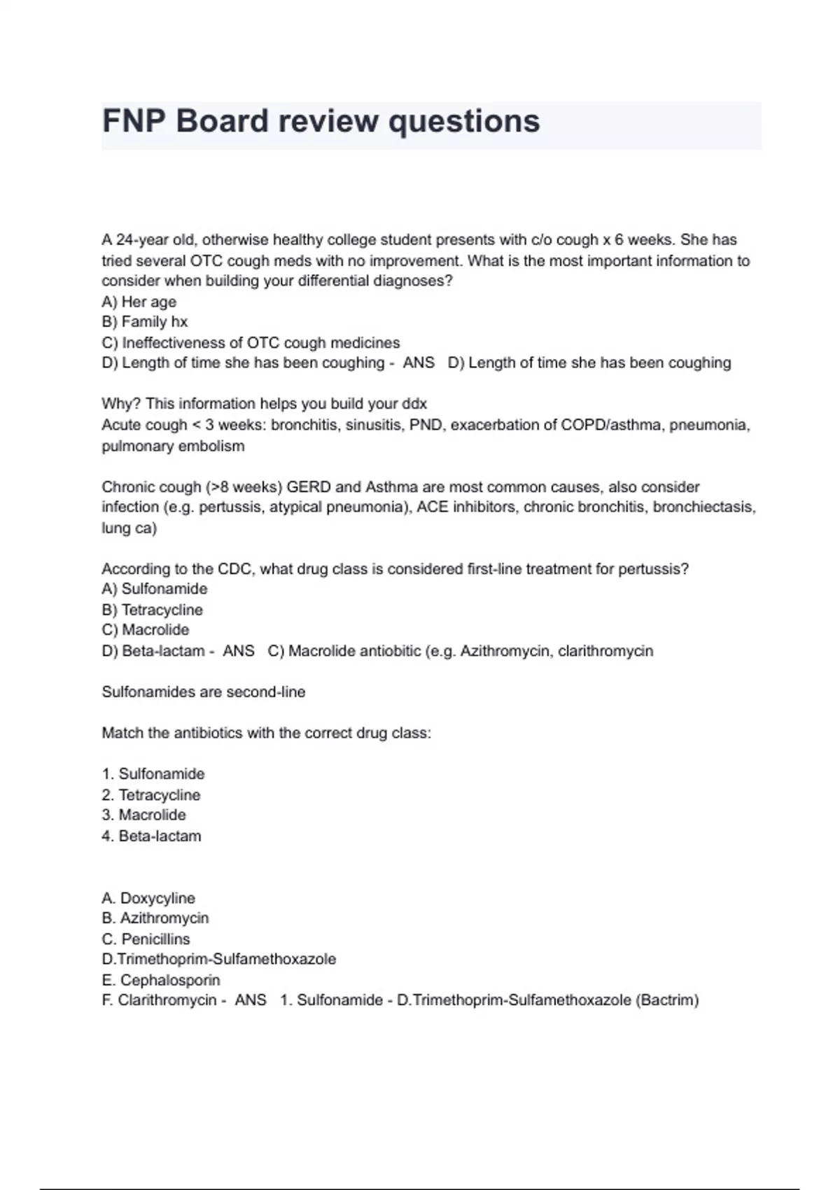 FNP Board review questions And Answers All Verified A 24-year old, otherwise healthy college student presents with c/o cough x 6 weeks. She has tried several OTC cough meds with no improvement. What is the most important information to consider when building your differential diagnoses? A) Her age B) Family hx C) Ineffectiveness of OTC cough medicines D) Length of time she has been coughing - ANS D) Length of time she has been coughing Why? This information helps you build your ddx Acute cough < 3 weeks: bronchitis, sinusitis, PND, exacerbation of COPD/asthma, pneumonia, pulmonary embolism Chronic cough (>8 weeks) GERD and Asthma are most common causes, also consider infection (e.g. pertussis, atypical pneumonia), ACE inhibitors, chronic bronchitis, bronchiectasis, lung ca) According to the CDC, what drug class is considered first-line treatment for pertussis? A) Sulfonamide B) Tetracycline C) Macrolide D) Beta-lactam - ANS C) Macrolide antiobitic (e.g. Azithromycin, clarithromycin Sulfonamides are second-line Match the antibiotics with the correct drug class: 1. Sulfonamide 2. Tetracycline 3. Macrolide 4. Beta-lactam A. Doxycyline B. Azithromycin C. Penicillins D.Trimethoprim-Sulfamethoxazole E. Cephalosporin F. Clarithromycin - ANS 1. Sulfonamide - D.Trimethoprim-Sulfamethoxazole (Bactrim)