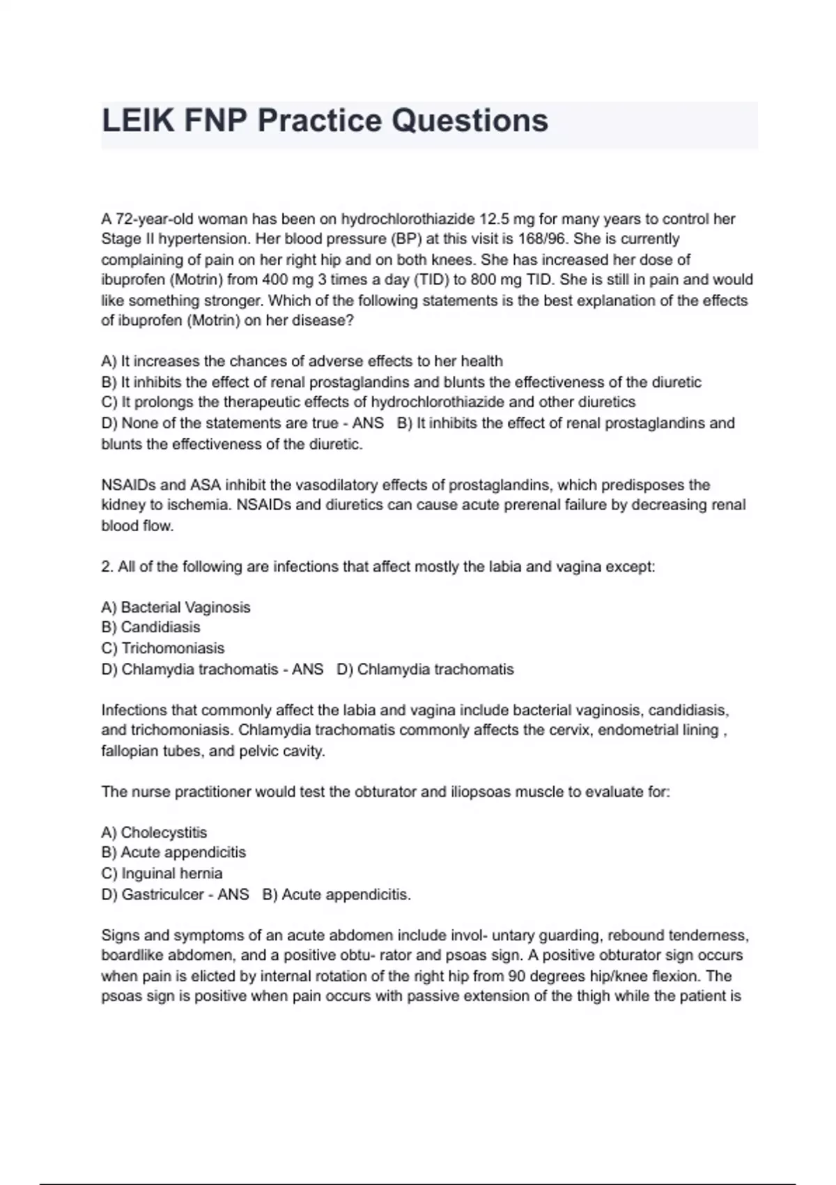LEIK FNP Practice Questions And Answers All Correct And Verified By An Expert A+ Graded A 72-year-old woman has been on hydrochlorothiazide 12.5 mg for many years to control her Stage II hypertension. Her blood pressure (BP) at this visit is 168/96. She is currently complaining of pain on her right hip and on both knees. She has increased her dose of ibuprofen (Motrin) from 400 mg 3 times a day (TID) to 800 mg TID. She is still in pain and would like something stronger. Which of the following statements is the best explanation of the effects of ibuprofen (Motrin) on her disease? A) It increases the chances of adverse effects to her health B) It inhibits the effect of renal prostaglandins and blunts the effectiveness of the diuretic C) It prolongs the therapeutic effects of hydrochlorothiazide and other diuretics D) None of the statements are true - ANS B) It inhibits the effect of renal prostaglandins and blunts the effectiveness of the diuretic. NSAIDs and ASA inhibit the vasodilatory effects of prostaglandins, which predisposes the kidney to ischemia. NSAIDs and diuretics can cause acute prerenal failure by decreasing renal blood flow. 2. All of the following are infections that affect mostly the labia and vagina except: A) Bacterial Vaginosis B) Candidiasis C) Trichomoniasis D) Chlamydia trachomatis - ANS D) Chlamydia trachomatis Infections that commonly affect the labia and vagina include bacterial vaginosis, candidiasis, and trichomoniasis. Chlamydia trachomatis commonly affects the cervix, endometrial lining , fallopian tubes, and pelvic cavity. The nurse practitioner would test the obturator and iliopsoas muscle to evaluate for: A) Cholecystitis B) Acute appendicitis C) Inguinal hernia D) Gastriculcer - ANS B) Acute appendicitis. Signs and symptoms of an acute abdomen include invol- untary guarding, rebound tenderness, boardlike abdomen, and a positive obtu- rator and psoas sign. A positive obturator sign occurs when pain is elicted by internal rotation of the right hip from 90 degrees hip/knee flexion. The psoas sign is positive when pain occurs with passive extension of the thigh while the patient i