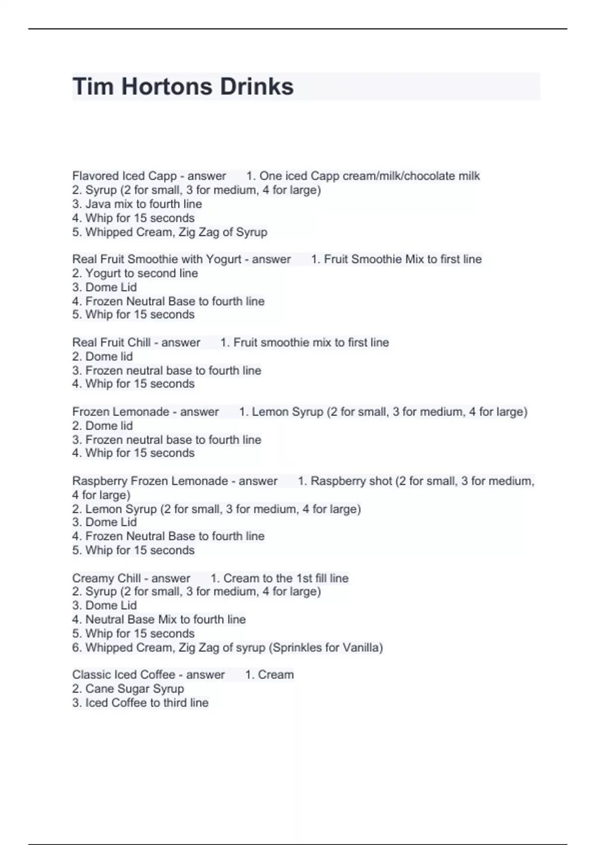 Tim Hortons Drinks Questions and Answers 100% Accurate