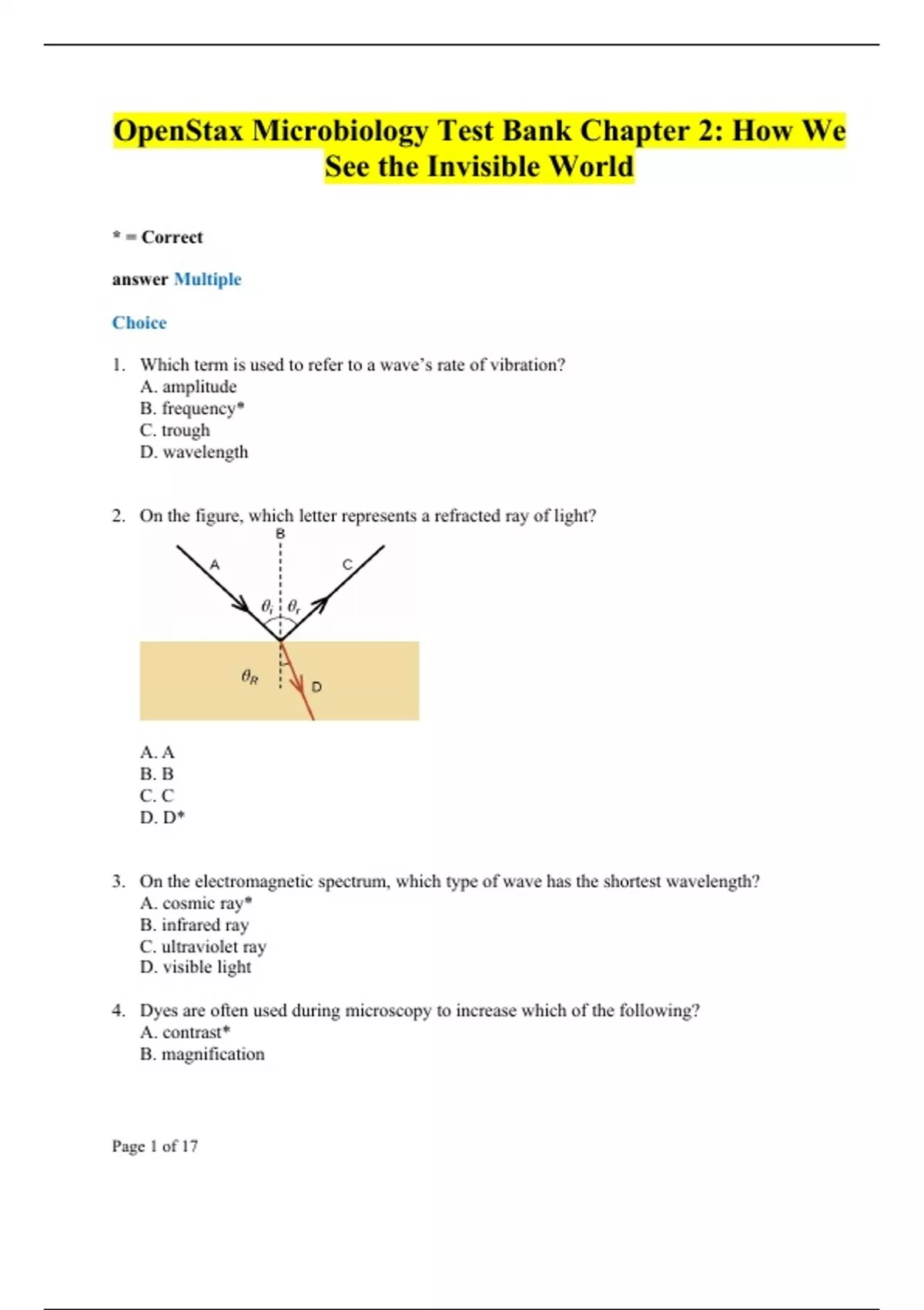 OpenStax Microbiology Test Bank Chapter 2: How We See the Invisible World * = Correct answer Multiple Choice 1. Which term is used to refer to a wave’s rate of vibration? A. amplitude B. frequency* C. trough D. wavelength 2. On the figure, which letter represents a refracted ray of light? A. A B. B C. C D. D* 3. On the electromagnetic spectrum, which type of wave has the shortest wavelength? A. cosmic ray* B. infrared ray C. ultraviolet ray D. visible light 4. Dyes are often used during microscopy to increase which of the following? A. contrast* B. magnification C. motility D. resolution 5. Which of the following was the first to use the term “cells”? A. Robert Hooke* B. Robert Koch C. Carolus Linnaeus D. Antonie van Leeuwenhoek 6. Which of the following is the typical magnification of an object viewed using a 10× ocular lens and a 100× objective lens on a brightfield microscope? A. 1× B. 10× C. 100× D. 1000×* 7. Most modern microscopes have two eyepieces, meaning that they are which of the following? A. binocular* B. monocular C. oil immersion D. trinocular 8. An annular stop is used for which type of microscopy? A. confocal B. darkfield C. fluorescence D. phase contrast* 9. Which of the following is the specific name for a stain that colors the background but not the specimen? A. acid-fast stain B. counterstain C. differential stain D. negative stain* 10. Which type of microscopy would work best for viewing internal cell structures? A. atomic force microscopy B. scanning electron microscopy C. scanning tunneling microscopy D. transmission electron microscopy* 11. The Gram-staining procedure is best described as which of the following? A. complex staining B. differential staining* C. negative staining D. simple staining 12. When there is a substantial difference in refractive index between two materials, which of the following describes what will happen to light passing from one material to the other? A. It will fail to be refracted. B. It will undergo a large amount of refraction.* C. It will undergo a small amount of refraction. D. It will undergo a variable amount of refraction. 13. In microscopy, the focal length refers to which of the following? A. a description of the wavelength needed for an image to be in focus B. a measure of the amount of refraction produced by a lens C. a measure of the thickness of the lens needed for an image to be in focus D. the distance to the image point (at which all light entering a lens is parallel)* 14. Which of the following are pigments used in microscopy to absorb and reflect light? A. chromatographs B. chromophores* C. oilophores D. photophores 15. Negative staining is the standard approach used to visualize which structure(s)? A. capsules* B. endospores C. flagella D. nucleoid regions 16. Which is a standard mordant used in flagella staining? A. basic fuchsin B. iodine C. safranin D. tannic acid* 17. Which of the following pairs are common acid-fast staining techniques? A. Gram and Kinyoun B. negative and Schaeffer-Fulton C. Ziehl-Neelsen and Kinyoun* D. Ziehl-Neelsen and Schaeffer-Fulton 18. Which is the primary stain used in the Ziehl-Neelsen technique? A. acid-alcohol B. carbolfuchsin* C. crystal violet D. methylene blue 19. Which is the correct order of steps in Gram staining? A. crystal violet stain, ethanol decolorization, Gram’s iodine mordant, safranin counterstain B. crystal violet stain, Gram’s iodine mordant, ethanol decolorization, safranin counterstain* C. ethanol stain, crystal violet rinse, safranin counterstain, Gram’s iodine mordant D. safranin stain, Gram’s iodine mordant, ethanol decolorization, crystal violet counterstain 20. It is important to fix bacterial smears on a slide for which of the following reasons? A. to attach them to the slide* B. to cause swelling of the cell to make interior structures more visible C. to enhance the uptake of stains 21. Which of the following is not commonly used for chemical fixation? A. acetic acid B. ethanol C. glutaraldehyde D. iodine* 22. Which of the following is not involved in preparing a bacterial slide for Gram staining? A. allowing the sample to dry on the slide B. fixing the specimen to the slide C. placing a smear on the slide D. preparing a wet mount* 23. Which of the following most specifically refers to stains with positively charged chromophores? A. acid-fast dyes B. acidic dyes C. basic dyes* D. positive dyes 24. Which of the following most specifically refers to a stain that dyes a specimen rather than the background? A. counterstain