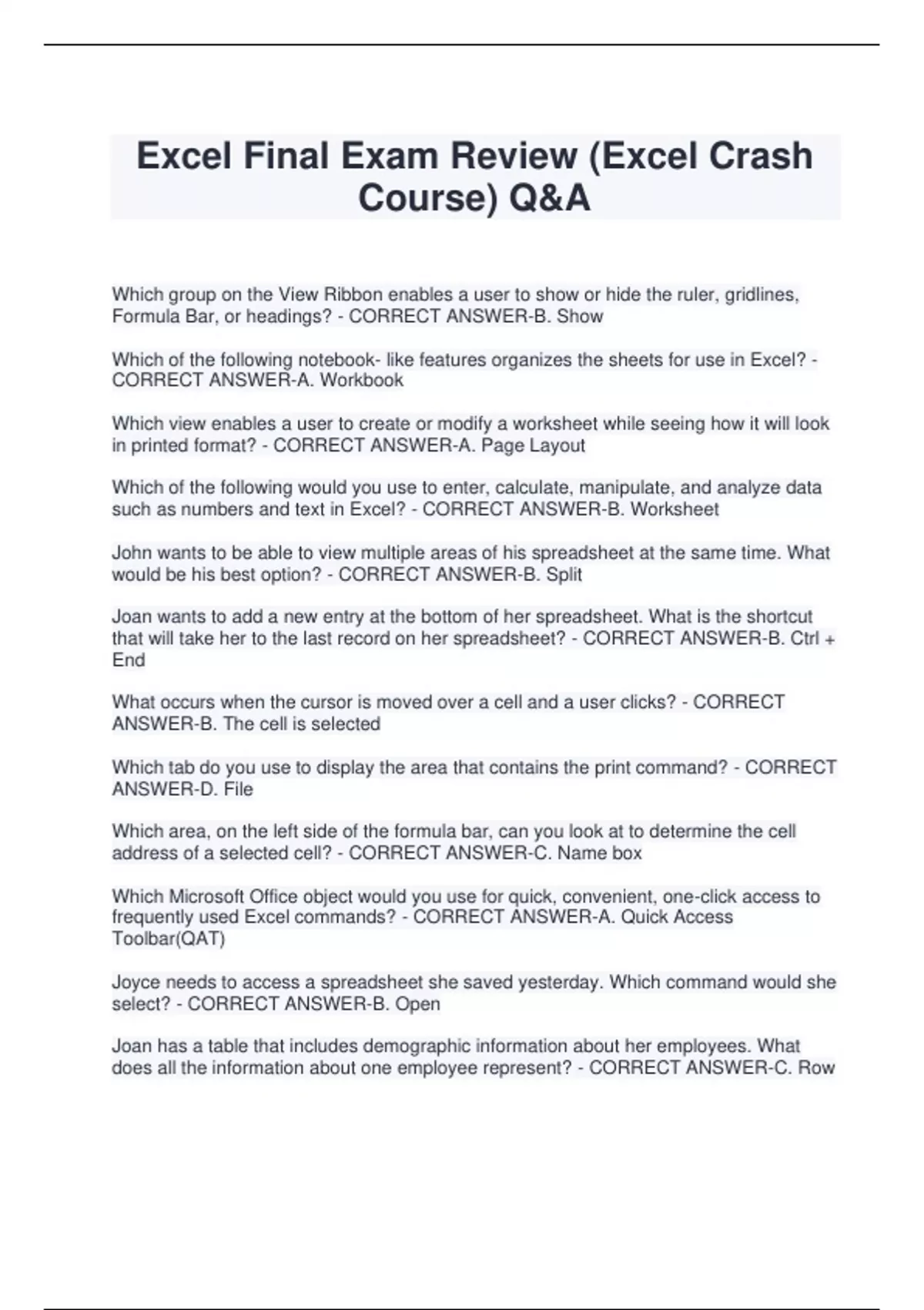 Excel Final Exam Review (Excel Crash Course) Q&A Which group on the View Ribbon enables a user to show or hide the ruler, gridlines, Formula Bar, or headings? - CORRECT ANSWER-B. Show Which of the following notebook- like features organizes the sheets for use in Excel? - CORRECT ANSWER-A. Workbook Which view enables a user to create or modify a worksheet while seeing how it will look in printed format? - CORRECT ANSWER-A. Page Layout Which of the following would you use to enter, calculate, manipulate, and analyze data such as numbers and text in Excel? - CORRECT ANSWER-B. Worksheet John wants to be able to view multiple areas of his spreadsheet at the same time. What would be his best option? - CORRECT ANSWER-B. Split Joan wants to add a new entry at the bottom of her spreadsheet. What is the shortcut that will take her to the last record on her spreadsheet? - CORRECT ANSWER-B. Ctrl + End What occurs when the cursor is moved over a cell and a user clicks? - CORRECT ANSWER-B. The cell is selected Which tab do you use to display the area that contains the print command? - CORRECT ANSWER-D. File Which area, on the left side of the formula bar, can you look at to determine the cell address of a selected cell? - CORRECT ANSWER-C. Name box Which Microsoft Office object would you use for quick, convenient, one-click access to frequently used Excel commands? - CORRECT ANSWER-A. Quick Access Toolbar(QAT) Joyce needs to access a spreadsheet she saved yesterday. Which command would she select? - CORRECT ANSWER-B. Open Joan has a table that includes demographic information about her employees. What does all the information about one employee represent? - CORRECT ANSWER-C. Row Which of the following software programs is a powerful spreadsheet program that allows users to organize data, complete calculations, and graph data? - CORRECT ANSWERC. Excel Which view is the default view used in Microsoft Excel? - CORRECT ANSWER-C. Normal Which ribbon option opens a related dialog box? - CORRECT ANSWER-C. Launcher What command do you use to increase or decrease the view of a selected cell or range of cells to fill the Excel Window area for better visibility? - CORRECT ANSWER-D. Zoom to Selection What feature was created for users who prefer to use the keyboard rather than the mouse, and provides keyboard code icons that may be used in conjunction with the ALT key? - CORRECT ANSWER-D. Key Tips Sharon's spreadsheet contains information about the number of music downloads in F25. "25" identifies the: - CORRECT ANSWER-D. Row What command will arrange Microsoft Excel windows so that they appear side by side on the screen? - CORRECT ANSWER-C. Arrange All Joan has entered her name in the First Name field in cell B2 of her table. What does her First Name represent in the table? - CORRECT ANSWER-A. Entry Which command do you use to close an open file and completely exit the Microsoft Excel program? - CORRECT ANSWER-C. Exit In Microsoft Excel, which feature makes an exact replica of the cell data and format while keeping the original cell intact? A. Paste B. Move C. Cut D. Copy - CORRECT ANSWER-D. Copy Sharon's spreadsheet contains information about the number of music downloads in F1:F25.F1:F25 represents a: A. Cell B. Column C. Range D. Row - CORRECT ANSWER-C. Range When entering data into a cell, which keyboard key is used to remove characters to the left of the insertion point? A. Delete key B. Backspace Key C. Left arrow key D. Enter key - CORRECT ANSWERB. Backspace key Joan is creating a table that will include demographic information about her employees. What is each header in her table considered? A. Label B. Value C. Formula D. Function -