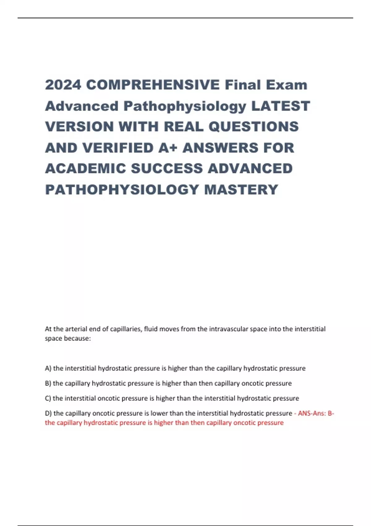 The "2024 Comprehensive Final Exam Advanced Pathophysiology" is a high-stakes assessment designed to evaluate students' understanding of advanced concepts in pathophysiology. This exam likely serves as a culmination of coursework in advanced pathophysiology and assesses students' ability to apply theoretical knowledge to clinical scenarios #AdvancedPathophysiology #FinalExam #NursingEducation #ClinicalScenarios #CriticalThinking #EvidenceBasedPractice #MultisystemConcepts #NursePractitioners #NurseEducators #NursingAssessment #NursingStudents #PathophysiologyExam #HealthcareEducation
