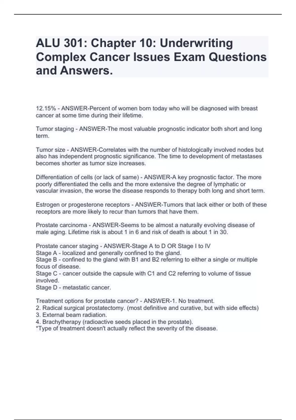 ALU 301: Chapter 10: Underwriting Complex Cancer Issues Exam Questions and Answers.