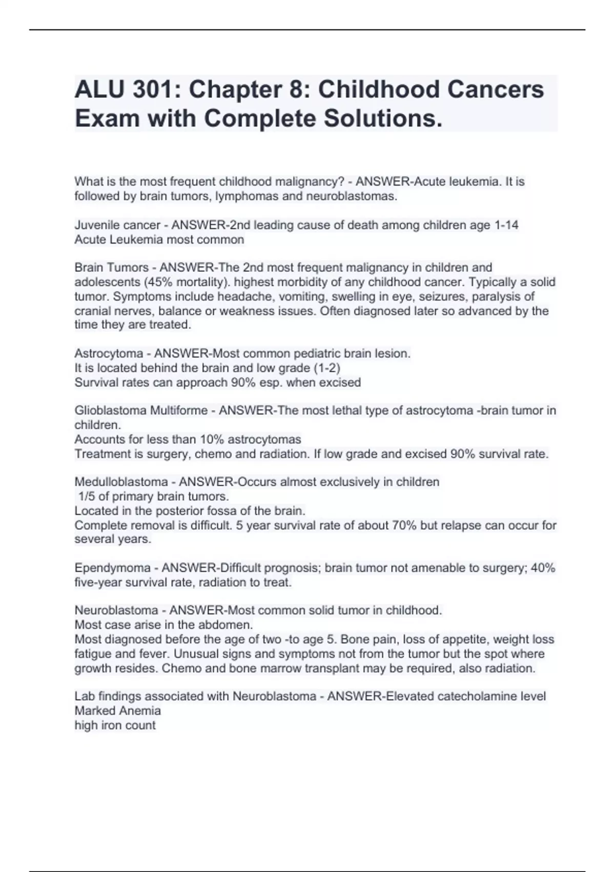 What is the most frequent childhood malignancy? - ANSWER-Acute leukemia. It is followed by brain tumors, lymphomas and neuroblastomas. Juvenile cancer - ANSWER-2nd leading cause of death among children age 1-14 Acute Leukemia most common Brain Tumors - ANSWER-The 2nd most frequent malignancy in children and adolescents (45% mortality). highest morbidity of any childhood cancer. Typically a solid tumor. Symptoms include headache, vomiting, swelling in eye, seizures, paralysis of cranial nerves, balance or weakness issues. Often diagnosed later so advanced by the time they are treated. Astrocytoma - ANSWER-Most common pediatric brain lesion. It is located behind the brain and low grade (1-2) Survival rates can approach 90% esp. when excised Glioblastoma Multiforme - ANSWER-The most lethal type of astrocytoma -brain tumor in children. Accounts for less than 10% astrocytomas Treatment is surgery, chemo and radiation. If low grade and excised 90% survival rate. Medulloblastoma - ANSWER-Occurs almost exclusively in children 1/5 of primary brain tumors. Located in the posterior fossa of the brain. Complete removal is difficult. 5 year survival rate of about 70% but relapse can occur for several years. Ependymoma - ANSWER-Difficult prognosis; brain tumor not amenable to surgery; 40% five-year survival rate, radiation to treat. Neuroblastoma - ANSWER-Most common solid tumor in childhood. Most case arise in the abdomen. Most diagnosed before the age of two -to age 5. Bone pain, loss of appetite, weight loss fatigue and fever. Unusual signs and symptoms not from the tumor but the spot where growth resides. Chemo and bone marrow transplant may be required, also radiation. Lab findings associated with Neuroblastoma - ANSWER-Elevated catecholamine level Marked Anemia high iron count High platelet count Nephroblastoma -Wilm's tumor - ANSWER-Arises from the kidney 3 separate elements: blatema, epithelia and stroma. Most common in preschool children. 5 year survival rate of about 90%, worse for older Surgery followed by chemo and radiation to treat Most common sign is asymptomatic mass or swelling Retinoblastoma - ANSWER-Diagnosed by the sign of leucocoria, a white papillary reflex to the reflection of light found during an ophthalmologic exam. So