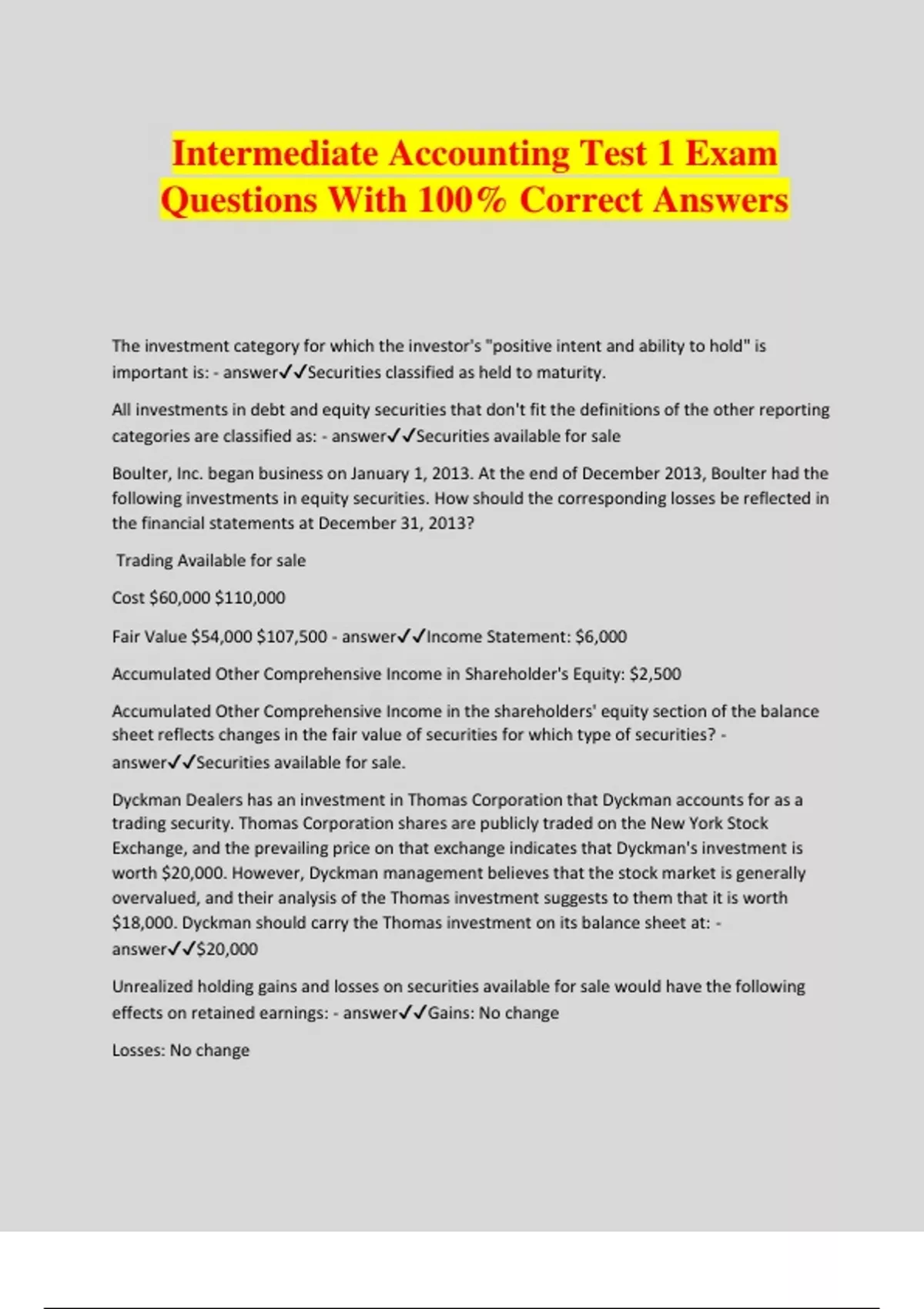 Intermediate Accounting Test 1 Exam Questions With 100% Correct Answers The investment category for which the investor's "positive intent and ability to hold" is important is: - answerSecurities classified as held to maturity. All investments in debt and equity securities that don't fit the definitions of the other reporting categories are classified as: - answerSecurities available for sale Boulter, Inc. began business on January 1, 2013. At the end of December 2013, Boulter had the following investments in equity securities. How should the corresponding losses be reflected in the financial statements at December 31, 2013? Trading Available for sale Cost $60,000 $110,000 Fair Value $54,000 $107,500 - answerIncome Statement: $6,000 Accumulated Other Comprehensive Income in Shareholder's Equity: $2,500 Accumulated Other Comprehensive Income in the shareholders' equity section of the balance sheet reflects changes in the fair value of securities for which type of securities? - answerSecurities available for sale. Dyckman Dealers has an investment in Thomas Corporation that Dyckman accounts for as a trading security. Thomas Corporation shares are publicly traded on the New York Stock Exchange, and the prevailing price on that exchange indicates that Dyckman's investment is worth $20,000. However, Dyckman management believes that the stock market is generally overvalued, and their analysis of the Thomas investment suggests to them that it is worth $18,000. Dyckman should carry the Thomas investment on its balance sheet at: - answer$20,000 Unrealized holding gains and losses on securities available for sale would have the following effects on retained earnings: - answerGains: No change Losses: No change
