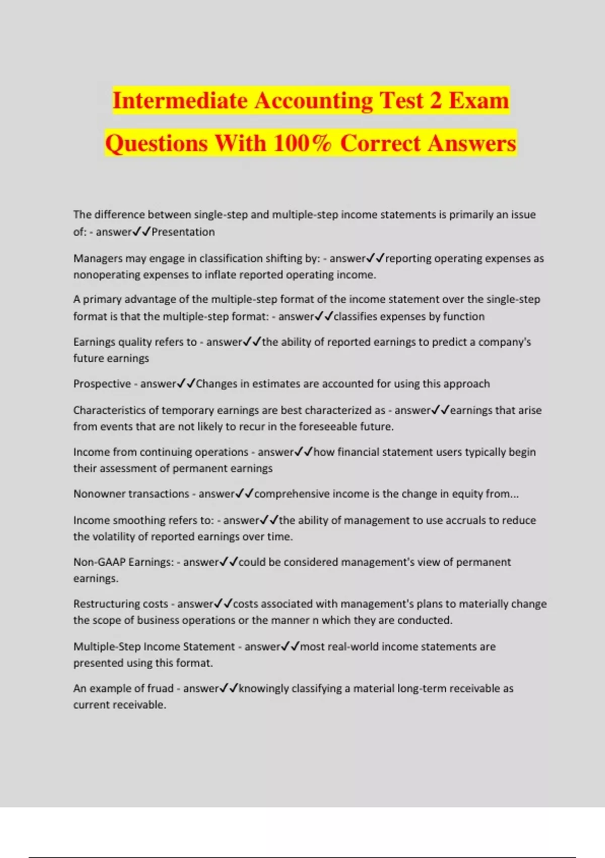 Intermediate Accounting Test 2 Exam Questions With 100% Correct Answers The difference between single-step and multiple-step income statements is primarily an issue of: - answerPresentation Managers may engage in classification shifting by: - answerreporting operating expenses as nonoperating expenses to inflate reported operating income. A primary advantage of the multiple-step format of the income statement over the single-step format is that the multiple-step format: - answerclassifies expenses by function Earnings quality refers to - answerthe ability of reported earnings to predict a company's future earnings Prospective - answerChanges in estimates are accounted for using this approach Characteristics of temporary earnings are best characterized as - answerearnings that arise from events that are not likely to recur in the foreseeable future. Income from continuing operations - answerhow financial statement users typically begin their assessment of permanent earnings Nonowner transactions - answercomprehensive income is the change in equity from... Income smoothing refers to: - answerthe ability of management to use accruals to reduce the volatility of reported earnings over time. Non-GAAP Earnings: - answercould be considered management's view of permanent earnings. Restructuring costs - answercosts associated with management's plans to materially change the scope of business operations or the manner n which they are conducted. Multiple-Step Income Statement - answermost real-world income statements are presented using this format. An example of fruad - answerknowingly classifying a material long-term receivable as current receivable.
