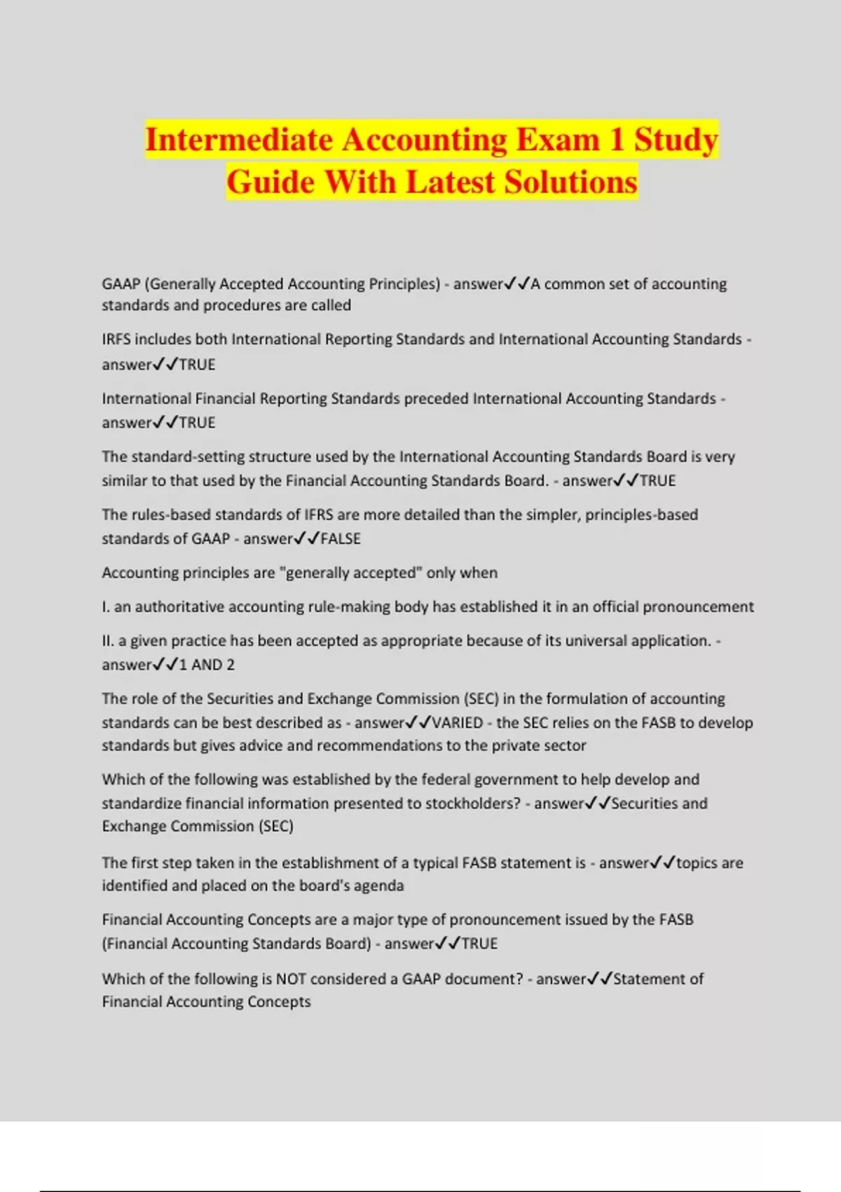 Intermediate Accounting Exam 1 Study Guide With Latest Solutions GAAP (Generally Accepted Accounting Principles) - answerA common set of accounting standards and procedures are called IRFS includes both International Reporting Standards and International Accounting Standards - answerTRUE International Financial Reporting Standards preceded International Accounting Standards - answerTRUE The standard-setting structure used by the International Accounting Standards Board is very similar to that used by the Financial Accounting Standards Board. - answerTRUE The rules-based standards of IFRS are more detailed than the simpler, principles-based standards of GAAP - answerFALSE Accounting principles are "generally accepted" only when I. an authoritative accounting rule-making body has established it in an official pronouncement II. a given practice has been accepted as appropriate because of its universal application. - answer1 AND 2 The role of the Securities and Exchange Commission (SEC) in the formulation of accounting standards can be best described as - answerVARIED - the SEC relies on the FASB to develop standards but gives advice and recommendations to the private sector Which of the following was established by the federal government to help develop and standardize financial information presented to stockholders? - answerSecurities and Exchange Commission (SEC) The first step taken in the establishment of a typical FASB statement is - answertopics are identified and placed on the board's agenda Financial Accounting Concepts are a major type of pronouncement issued by the FASB (Financial Accounting Standards Board) - answerTRUE Which of the following is NOT considered a GAAP document? - answerStatement of Financial Accounting Concepts