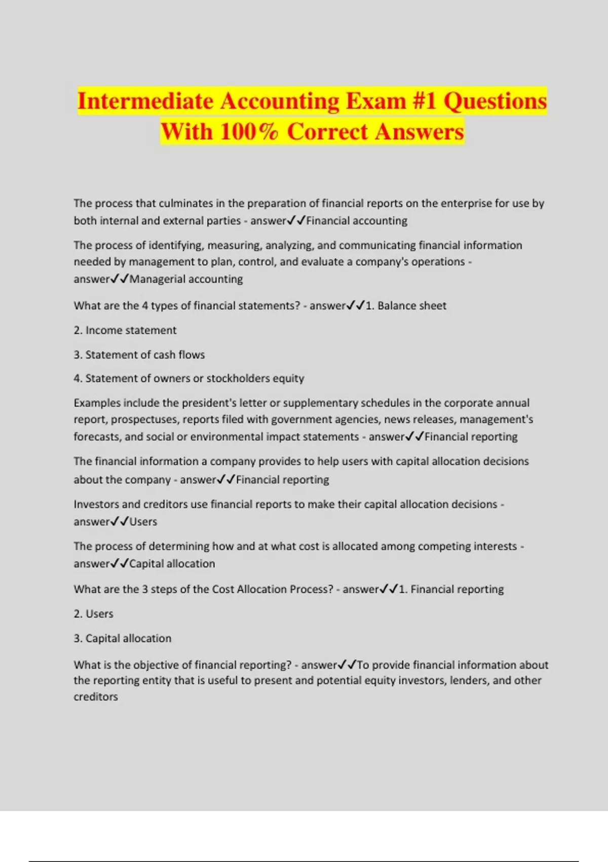 Intermediate Accounting Exam #1 Questions With 100% Correct Answers The process that culminates in the preparation of financial reports on the enterprise for use by both internal and external parties - answerFinancial accounting The process of identifying, measuring, analyzing, and communicating financial information needed by management to plan, control, and evaluate a company's operations - answerManagerial accounting What are the 4 types of financial statements? - answer1. Balance sheet 2. Income statement 3. Statement of cash flows 4. Statement of owners or stockholders equity Examples include the president's letter or supplementary schedules in the corporate annual report, prospectuses, reports filed with government agencies, news releases, management's forecasts, and social or environmental impact statements - answerFinancial reporting The financial information a company provides to help users with capital allocation decisions about the company - answerFinancial reporting Investors and creditors use financial reports to make their capital allocation decisions - answerUsers The process of determining how and at what cost is allocated among competing interests - answerCapital allocation What are the 3 steps of the Cost Allocation Process? - answer1. Financial reporting 2. Users 3. Capital allocation What is the objective of financial reporting? - answerTo provide financial information about the reporting entity that is useful to present and potential equity investors, lenders, and other creditors Provide financial reporting information to a wide variety of users - answerGeneral-purpose financial statements Provide at the least cost the most useful information possible - answerGeneral-purpose financial statements Identifies investors and creditors as the primary users for general-purpose financial statements - answerThe objective of financial reporting A perspective of general-purpose financial reporting where companies are viewed as separate and distinct from their owners or present shareholders - answerEntity perspective A perspective of general-purpose financial reporting that is focused only on the needs of the shareholders - answerProprietary perspective An approach used when investors are interested in financial reporting because it provides information that is careful for making decisions - answerDecision-usefulness approach Ensures that a company records events that change its financial statements in the periods in which the events occur, rather than only in the periods in which it receives or pays cash - answerAccrual-basis accounting Companies prepare these to meet the needs, and to satisfy the stewardship reporting responsibility of management - answerGeneral-purpose financial statements The common set of accounting standards and procedures - answerGenerally Accepted Accounting Principles (GAAP) Means either than an authoritative accounting rule-making body has established a principle or reporting in a given area or that over time a given practice has been accepted as appropriate because of its universal application - answer"Generally accepted" Who are the parties involved in standard-setting? - answer1. SEC 2. AICPA 3. FASB Established by the federal government to help develop and standardize financial information present to stockholders - answerSecurities and Exchange Commission (SEC) A federal agency that administers the Securities Exchange Act of 1934 - answerSEC The SEC requires registrants to adhere to _____. - answerGAAP The SEC relies on _____ to develop accounting standards. - answerFASB The national professional organization of practicing CPAs and an important contributor to the development of GAAP - answerAmerican Institute of Certified Public Accountants (AICPA) A group appointed by the AICPA that is composed to practicing CPAs who issued 51 Accounting Research Bulletins during the years of 1939 to 1959 - answerCommittee on Accounting Procedure (CAP) Dealt with a variety of accounting problems, but failed to provide the needed structured body of accounting principles - answerAccounting Research Bulletins Created by the AICPA in response to the failure of Accounting Research Bulletins - answerAccounting Principles Board (APB) Major purposes were to advance the written expression of accounting principles and determined appropriate practices, and narrow the areas of difference and inconsistent in practice - answerAPB The Board's official pronouncements intended to be based mainly on research studies and be supported by reason and analysis - answerAPB opinions The accounting professions's leaders, anxious to avoid governmental rule-making, appointed this Study Group on Establishment of Accounting Principles - answerWheat Committee This group examined the organization and operation of the APB and determined the necessary changes to attain better results - answerWheat Committee This group submitted its recommendations to the AICPA Council in the Spring of 1972 , which led to the replacement of the APB with the Financial Accounting Standards Board (FASB) in 1973 - answerWheat Committee When the FASB replaced the APB, the AICPA established _____ as the committee authorized to speak for the AICPA in the area of financial accounting and reporting. - answerAccounting Standards Executive Committee (AcSC) What written communications does the AcSEC use to speak for the AICPA in the area of financial accounting and reporting? - answer1. Audit and Accounting Guides 2. Statements of Position (SOPs) 3. Practice Bulletins Summarize the accounting practices of specific industries and provide specific guidance on matters not addressed by the FASB - answerAudit and Accounting Guides Provide guidance on financial reporting topics until the FASB sets standards on the issue in questions - answerSOPs