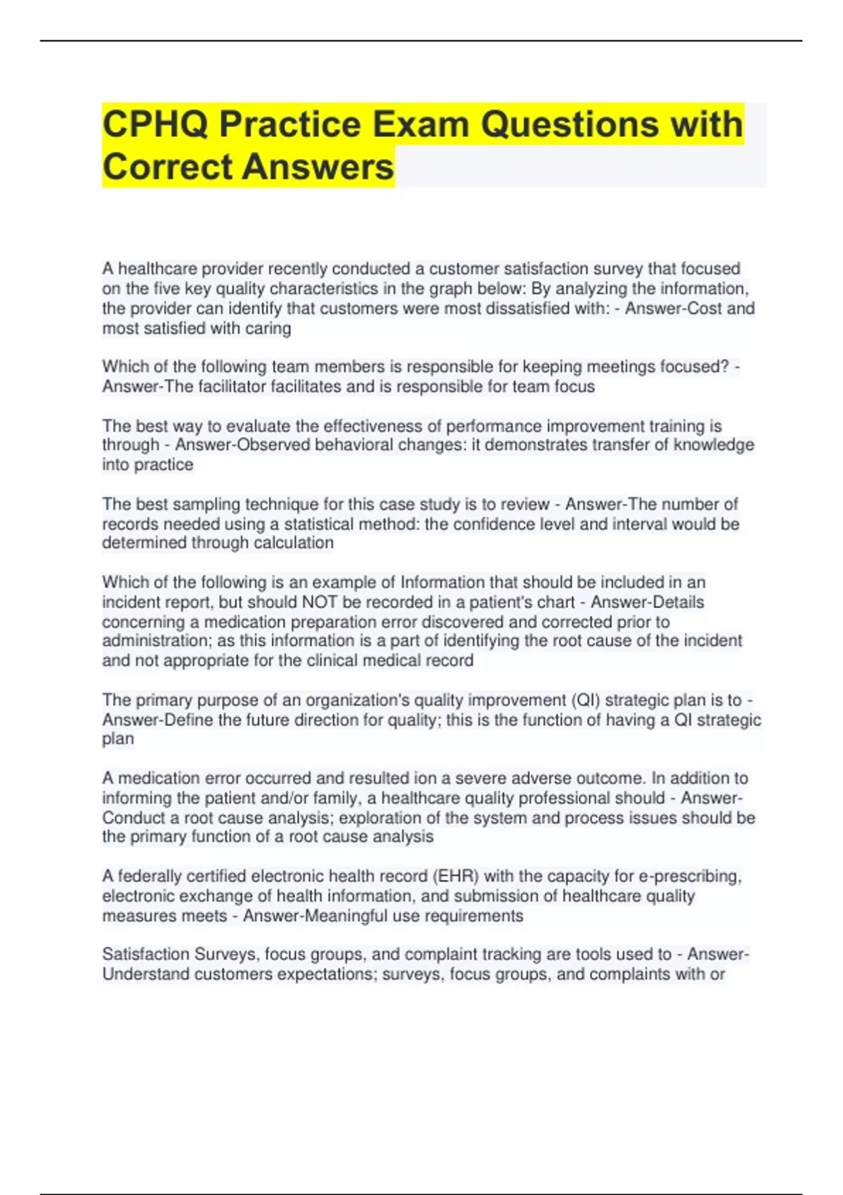 CPHQ Practice Exam Questions with Correct Answers A healthcare provider recently conducted a customer satisfaction survey that focused on the five key quality characteristics in the graph below: By analyzing the information, the provider can identify that customers were most dissatisfied with: - Answer-Cost and most satisfied with caring Which of the following team members is responsible for keeping meetings focused? - Answer-The facilitator facilitates and is responsible for team focus The best way to evaluate the effectiveness of performance improvement training is through - Answer-Observed behavioral changes: it demonstrates transfer of knowledge into practice The best sampling technique for this case study is to review - Answer-The number of records needed using a statistical method: the confidence level and interval would be determined through calculation Which of the following is an example of Information that should be included in an incident report, but should NOT be recorded in a patient's chart - Answer-Details concerning a medication preparation error discovered and corrected prior to administration; as this information is a part of identifying the root cause of the incident and not appropriate for the clinical medical record The primary purpose of an organization's quality improvement (QI) strategic plan is to - Answer-Define the future direction for quality; this is the function of having a QI strategic plan A medication error occurred and resulted ion a severe adverse outcome. In addition to informing the patient and/or family, a healthcare quality professional should - AnswerConduct a root cause analysis; exploration of the system and process issues should be the primary function of a root cause analysis A federally certified electronic health record (EHR) with the capacity for e-prescribing, electronic exchange of health information, and submission of healthcare quality measures meets - Answer-Meaningful use requirements Satisfaction Surveys, focus groups, and complaint tracking are tools used to - AnswerUnderstand customers expectations; surveys, focus groups, and complaints with or from customers can provide information directly from the customers regarding a variety of topics including customer expectations Deemed status refers to - Answer-Accreditation equivalency with a Centers for Medicare and Medicaid Services (CMS) survey; CMS allows deemed status with meeting all conditions of participation requirements through Joint Commission Accreditation A clinical pathway on the management of hip fractures has been developed by a multidisciplinary team and implemented in a large teaching hospital. After monitoring for 6 months, the length of stay continues to exceed the guidelines. Which of the following should be the next step? - Answer-Evaluate compliance with the pathway; evaluation of compliance with the proven pathway should be conducted first to see if that may be influencing the lack of change in the outcome A new quality director has reviewed the information related to the Quality Council minutes, and notes the following:- The council meets quarterly; meetings last approximately 2 hours, the council roster includes all clinical department managers and the quality director. Attendance ranges from 45-60% the primary role of the council is to receive department quality reports, which are then forwarded to the organizations's governing body. Based on the information above, which if the following actions is most appropriate? - Answer-Redefine the council's role to coordinate and prioritize quality activities Balanced scorecards are useful because they - Answer-Put strategy and vision at the center of an organization's effort; the balanced scorecard is a management framework that translates an organization's strategic objectives into a set of performance measures that are measured, monitored, and changed if necessary, to ensure that organizations strategic goals are met A root cause analysis team examined a serious medication error and recommended changes. Which of the following should be done next - Answer-The process owner should implement and assess effectiveness; the recommended changes need to be assigned ownership Refer to the following control chart: In assessing the timeliness for the administration of antibiotics for pneumonia, this control chart demonstrates - Answer-process of improvement An organization can best measure its effectiveness in meeting customer expectations by - Answer-analyzing satisfaction data; satisfaction data evaluates customer satisfaction