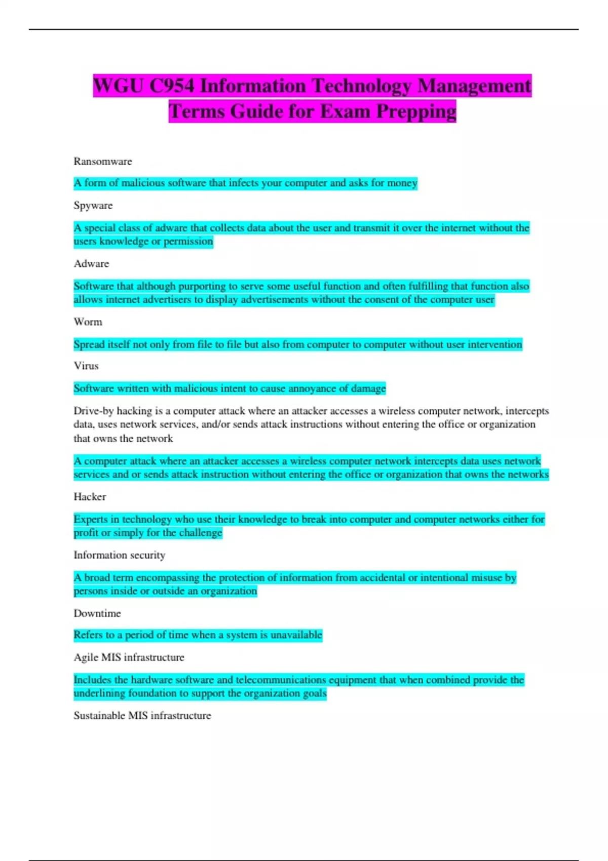 WGU C954 Information Technology Management Terms Guide for Exam Prepping Especially for one who is preparing for a Test around Information Security this ought to be very useful.
