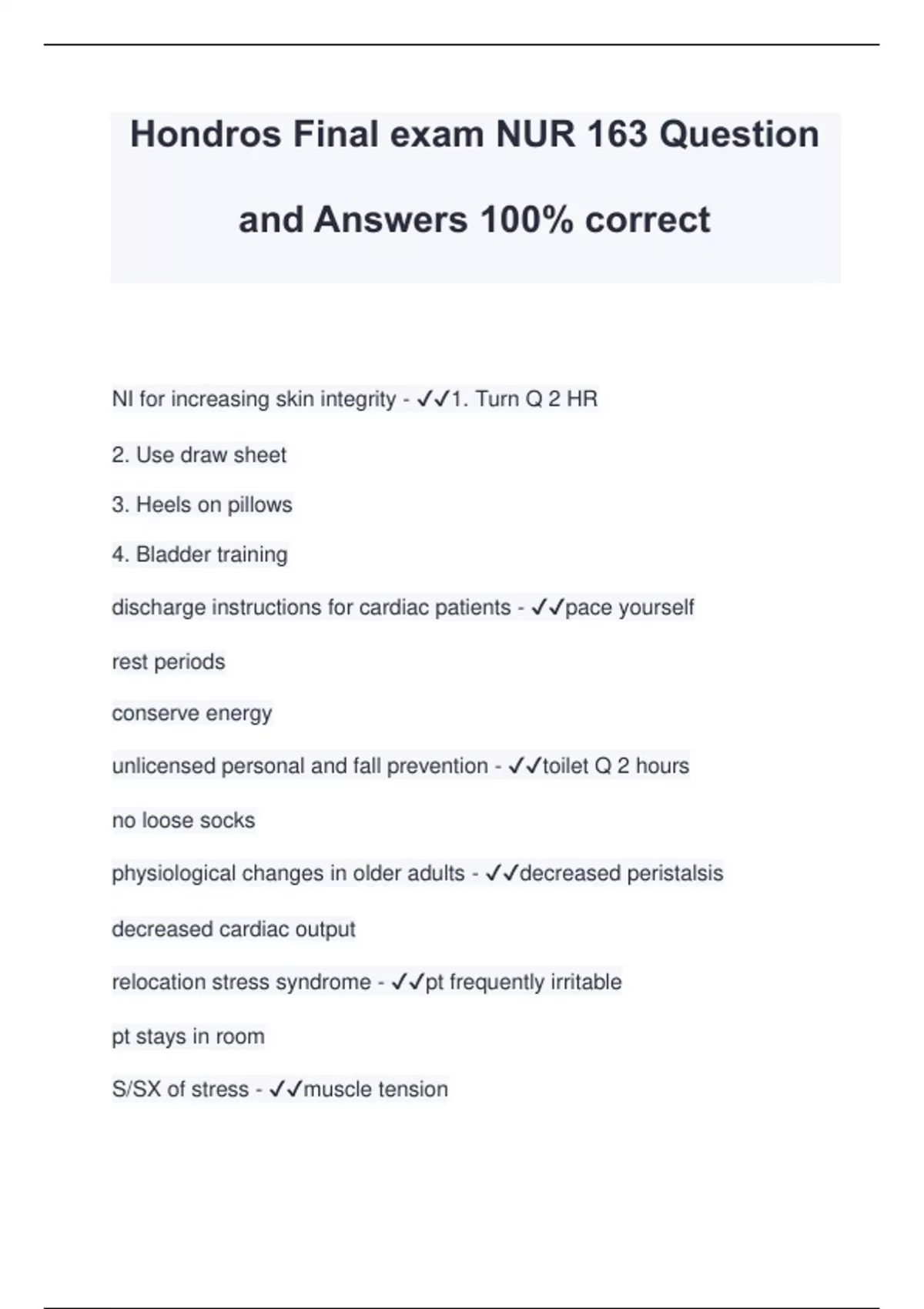 Hondros Final exam NUR 163 Question and Answers 100% correct NI for increasing skin integrity - 1. Turn Q 2 HR 2. Use draw sheet 3. Heels on pillows 4. Bladder training discharge instructions for cardiac patients - pace yourself rest periods conserve energy unlicensed personal and fall prevention - toilet Q 2 hours no loose socks physiological changes in older adults - decreased peristalsis decreased cardiac output relocation stress syndrome - pt frequently irritable pt stays in room S/SX of stress - muscle tension