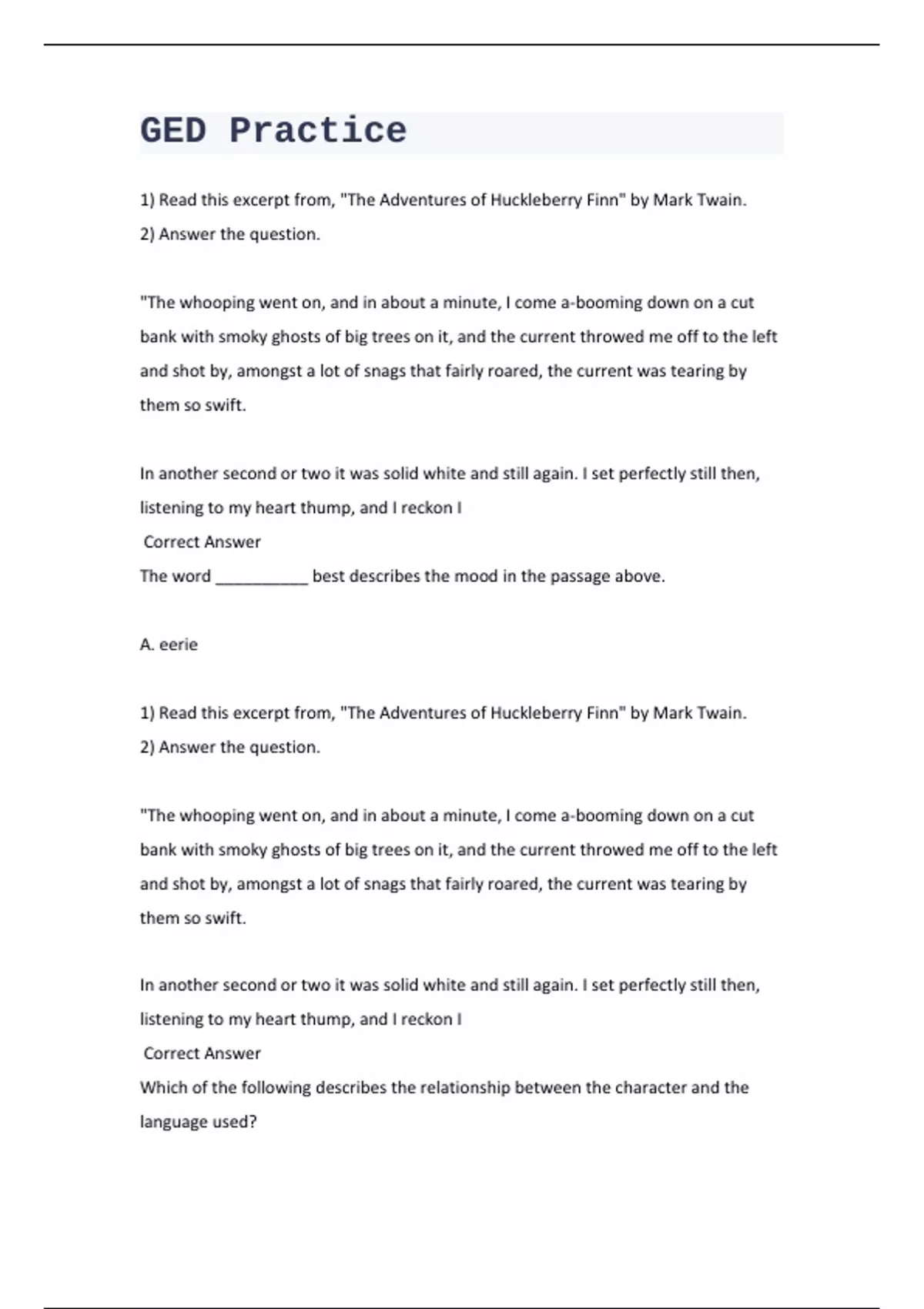 1) Read this excerpt from, "The Adventures of Huckleberry Finn" by Mark Twain. 2) Answer the question. "The whooping went on, and in about a minute, I come a-booming down on a cut bank with smoky ghosts of big trees on it, and the current throwed me off to the left and shot by, amongst a lot of snags that fairly roared, the current was tearing by them so swift. In another second or two it was solid white and still again. I set perfectly still then, listening to my heart thump, and I reckon I Correct Answer The word __________ best describes the mood in the passage above. A. eerie 1) Read this excerpt from, "The Adventures of Huckleberry Finn" by Mark Twain. 2) Answer the question. "The whooping went on, and in about a minute, I come a-booming down on a cut bank with smoky ghosts of big trees on it, and the current throwed me off to the left and shot by, amongst a lot of snags that fairly roared, the current was tearing by them so swift. In another second or two it was solid white and still again. I set perfectly still then, listening to my heart thump, and I reckon I Correct Answer Which of the following describes the relationship between the character and the language used?