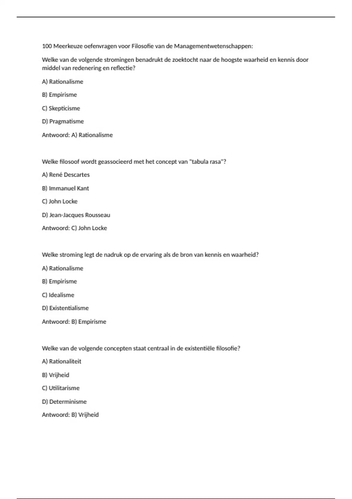 100 meerkeuze oefenvragen (het tentamen bestaat ook uit meerkeuzevragen) over het vak Filosofie van de Managementwetenschappen (MAN-BIN118).