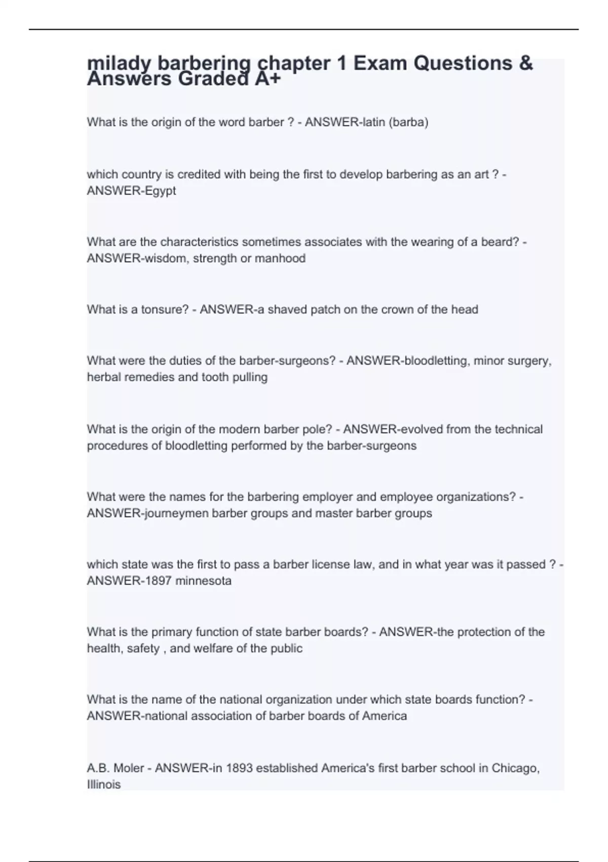 milady barbering chapter 1 Exam Questions & Answers Graded A+