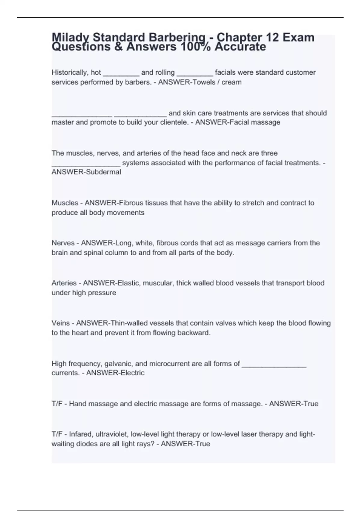 Historically, hot _________ and rolling _________ facials were standard customer services performed by barbers. - ANSWER-Towels / cream _______________ _____________ and skin care treatments are services that should master and promote to build your clientele. - ANSWER-Facial massage The muscles, nerves, and arteries of the head face and neck are three _________________ systems associated with the performance of facial treatments. - ANSWER-Subdermal Muscles - ANSWER-Fibrous tissues that have the ability to stretch and contract to produce all body movements Nerves - ANSWER-Long, white, fibrous cords that act as message carriers from the brain and spinal column to and from all parts of the body. Arteries - ANSWER-Elastic, muscular, thick walled blood vessels that transport blood under high pressure Veins - ANSWER-Thin-walled vessels that contain valves which keep the blood flowing to the heart and prevent it from flowing backward. High frequency, galvanic, and microcurrent are all forms of ________________ currents. - ANSWER-Electric
