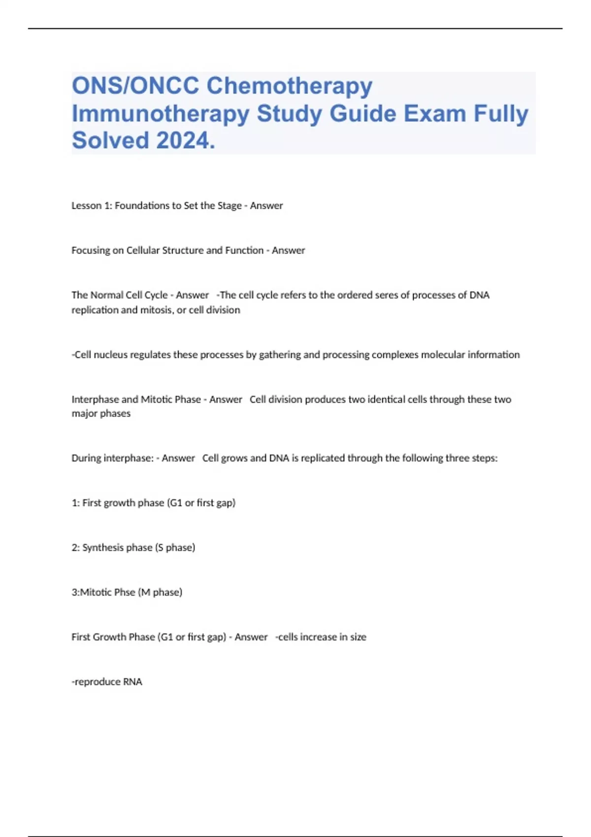 Lesson 1: Foundations to Set the Stage - Answer Focusing on Cellular Structure and Function - Answer The Normal Cell Cycle - Answer -The cell cycle refers to the ordered seres of processes of DNA replication and mitosis, or cell division -Cell nucleus regulates these processes by gathering and processing complexes molecular information Interphase and Mitotic Phase - Answer Cell division produces two identical cells through these two major phases During interphase: - Answer Cell grows and DNA is replicated through the following three steps: 1: First growth phase (G1 or first gap) 2: Synthesis phase (S phase) 3:Mitotic Phse (M phase) First Growth Phase (G1 or first gap) - Answer -cells increase in size -reproduce RNA