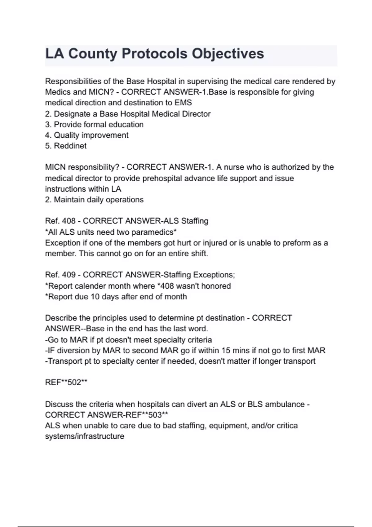 LA County Protocols Objectives Responsibilities of the Base Hospital in supervising the medical care rendered by Medics and MICN? - CORRECT ANSWER-1.Base is responsible for giving medical direction and destination to EMS 2. Designate a Base Hospital Medical Director 3. Provide formal education 4. Quality improvement 5. Reddinet MICN responsibility? - CORRECT ANSWER-1. A nurse who is authorized by the medical director to provide prehospital advance life support and issue instructions within LA 2. Maintain daily operations Ref. 408 - CORRECT ANSWER-ALS Staffing *All ALS units need two paramedics* Exception if one of the members got hurt or injured or is unable to preform as a member. This cannot go on for an entire shift. Ref. 409 - CORRECT ANSWER-Staffing Exceptions; *Report calender month where *408 wasn't honored *Report due 10 days after end of month Describe the principles used to determine pt destination - CORRECT ANSWER--Base in the end h