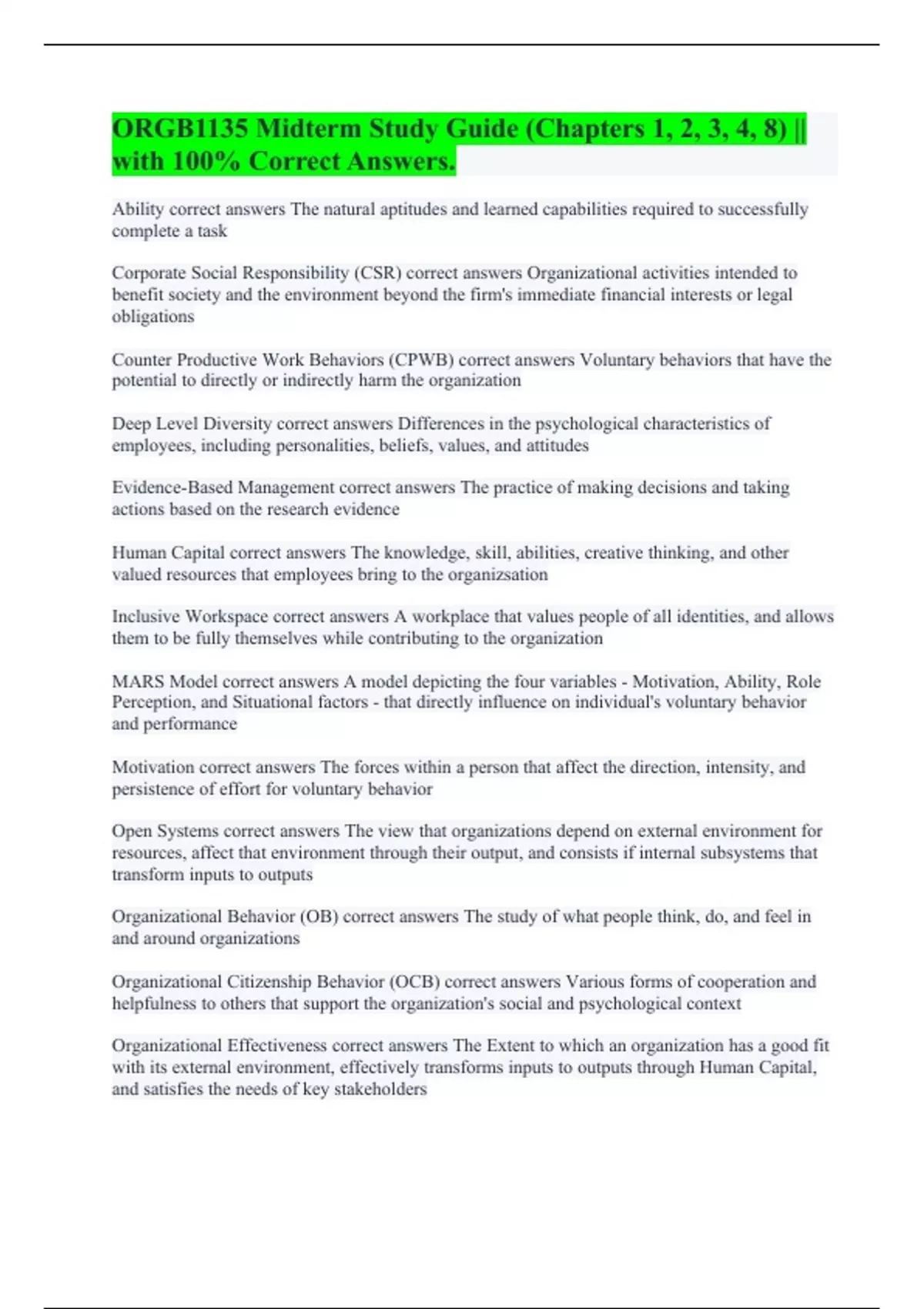 ORGB1135 Midterm Study Guide (Chapters 1, 2, 3, 4, 8) || with 100% Correct Answers.
