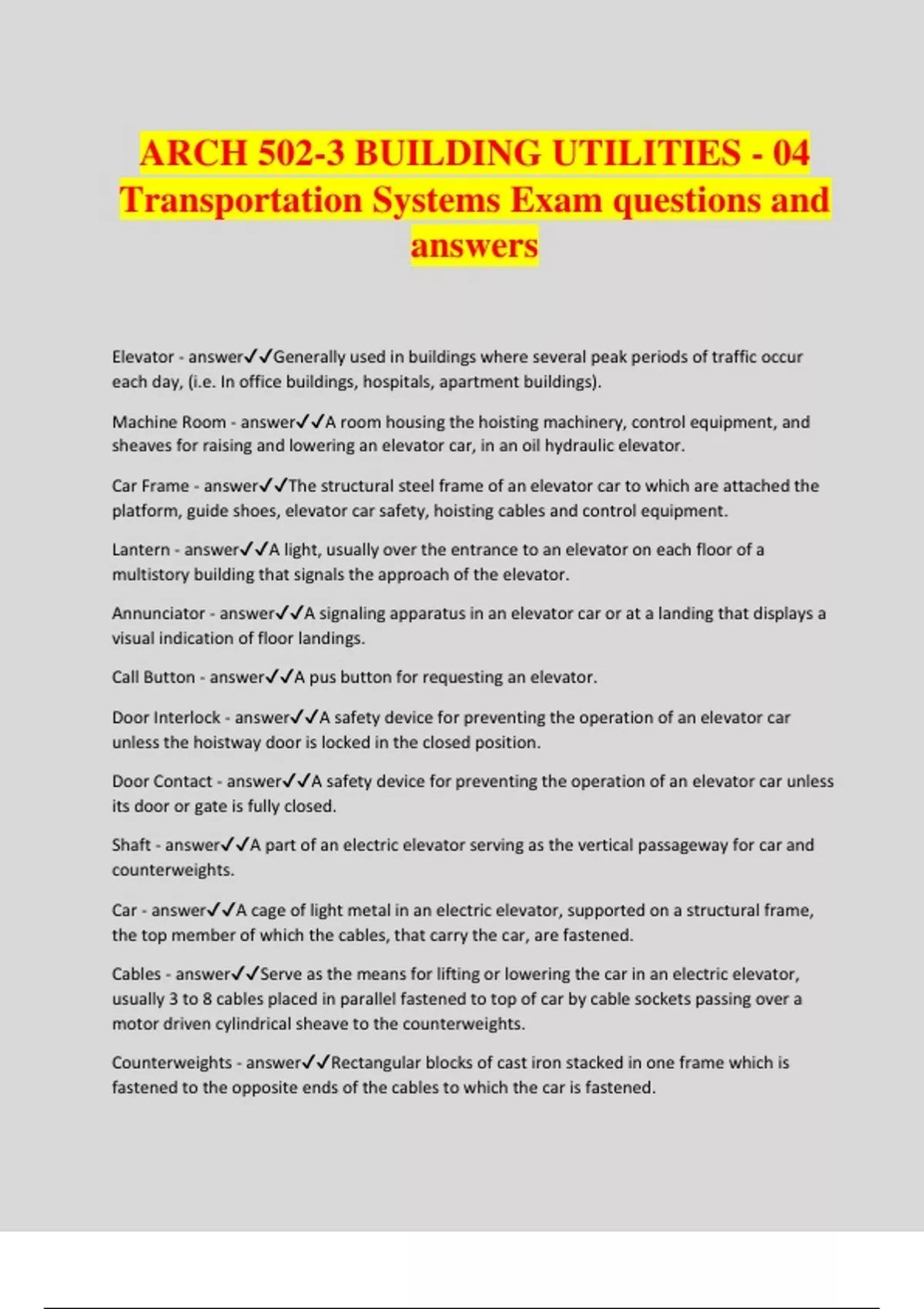 ARCH 502-3 BUILDING UTILITIES - 04 Transportation Systems Exam questions and answers Elevator - answerGenerally used in buildings where several peak periods of traffic occur each day, (i.e. In office buildings, hospitals, apartment buildings). Machine Room - answerA room housing the hoisting machinery, control equipment, and sheaves for raising and lowering an elevator car, in an oil hydraulic elevator. Car Frame - answerThe structural steel frame of an elevator car to which are attached the platform, guide shoes, elevator car safety, hoisting cables and control equipment. Lantern - answerA light, usually over the entrance to an elevator on each floor of a multistory building that signals the approach of the elevator. Annunciator - answerA signaling apparatus in an elevator car or at a landing that displays a visual indication of floor landings. Call Button - answerA pus button for requesting an elevator. Door Interlock - answerA safety device for preventing the operation of an elevator car unless the hoistway door is locked in the closed position. Door Contact - answerA safety device for preventing the operation of an elevator car unless its door or gate is fully closed. Shaft - answerA part of an electric elevator serving as the vertical passageway for car and counterweights. Car - answerA cage of light metal in an electric elevator, supported on a structural frame, the top member of which the cables, that carry the car, are fastened. Cables - answerServe as the means for lifting or lowering the car in an electric elevator, usually 3 to 8 cables placed in parallel fastened to top of car by cable sockets passing over a motor driven cylindrical sheave to the counterweights. Counterweights - answerRectangular blocks of cast iron stacked in one frame which is fastened to the opposite ends of the cables to which the car is fastened.