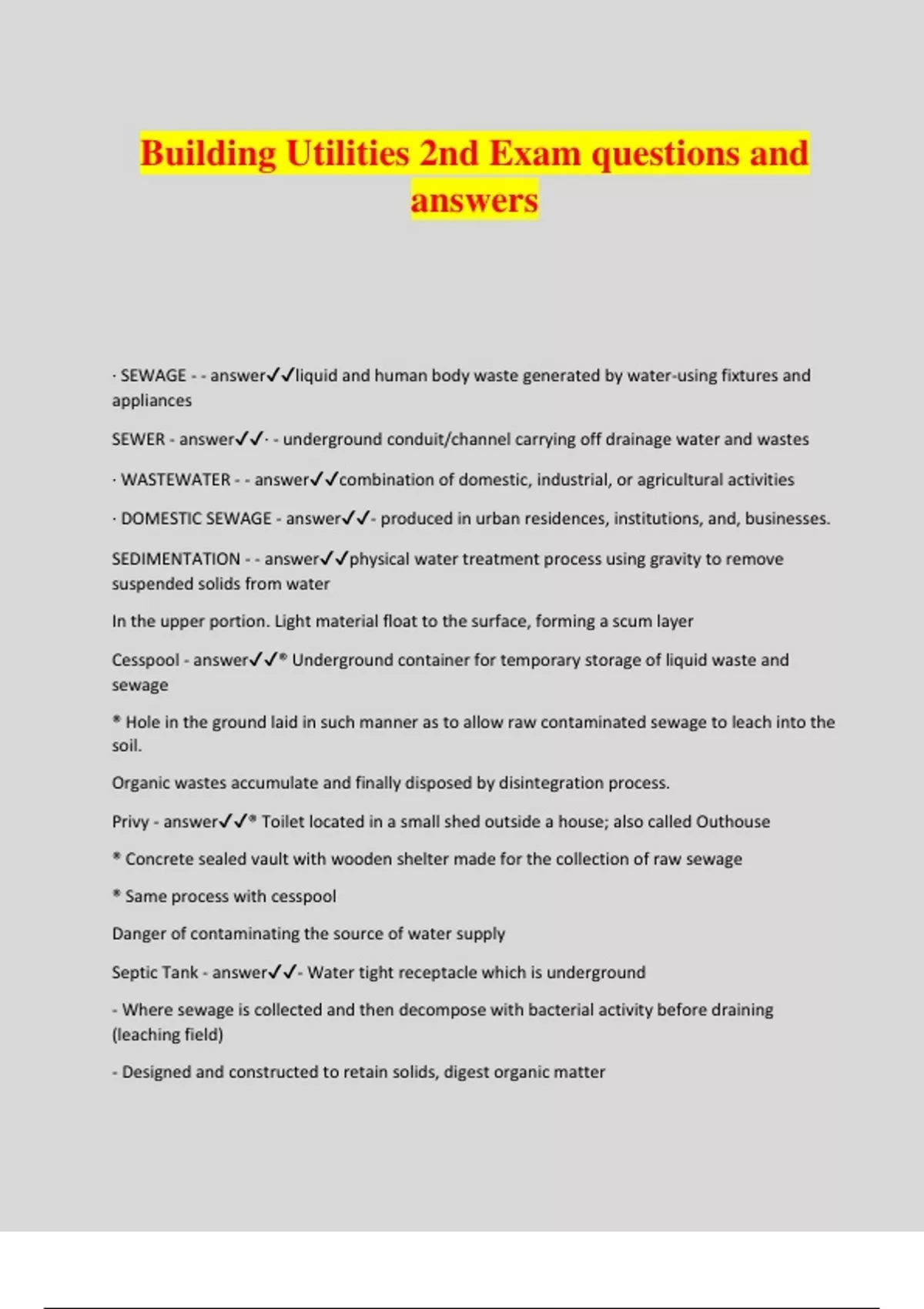 Building Utilities 2nd Exam questions and answers · SEWAGE - - answerliquid and human body waste generated by water-using fixtures and appliances SEWER - answer· - underground conduit/channel carrying off drainage water and wastes · WASTEWATER - - answercombination of domestic, industrial, or agricultural activities · DOMESTIC SEWAGE - answer- produced in urban residences, institutions, and, businesses. SEDIMENTATION - - answerphysical water treatment process using gravity to remove suspended solids from water In the upper portion. Light material float to the surface, forming a scum layer Cesspool - answer® Underground container for temporary storage of liquid waste and sewage ® Hole in the ground laid in such manner as to allow raw contaminated sewage to leach into the soil. Organic wastes accumulate and finally disposed by disintegration process. Privy - answer® Toilet located in a small shed outside a house; also called Outhouse ® Concrete sealed vault with wooden shelter made for the collection of raw sewage ® Same process with cesspool Danger of contaminating the source of water supply Septic Tank - answer- Water tight receptacle which is underground - Where sewage is collected and then decompose with bacterial activity before draining (leaching field) - Designed and constructed to retain solids, digest organic matter