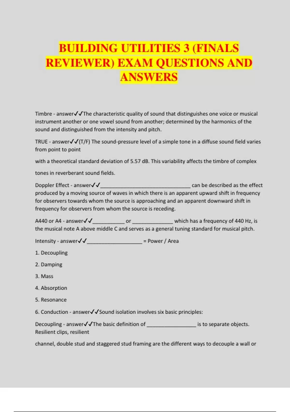 BUILDING UTILITIES 3 (FINALS REVIEWER) EXAM QUESTIONS AND ANSWERS Timbre - answerThe characteristic quality of sound that distinguishes one voice or musical instrument another or one vowel sound from another; determined by the harmonics of the sound and distinguished from the intensity and pitch. TRUE - answer(T/F) The sound-pressure level of a simple tone in a diffuse sound field varies from point to point with a theoretical standard deviation of 5.57 dB. This variability affects the timbre of complex tones in reverberant sound fields. Doppler Effect - answer_______________________________ can be described as the effect produced by a moving source of waves in which there is an apparent upward shift in frequency for observers towards whom the source is approaching and an apparent downward shift in frequency for observers from whom the source is receding. A440 or A4 - answer___________ or ______________ which has a frequency of 440 Hz, is the musical note A above middle C and serves as a general tuning standard for musical pitch. Intensity - answer___________________ = Power / Area 1. Decoupling 2. Damping 3. Mass 4. Absorption 5. Resonance 6. Conduction - answerSound isolation involves six basic principles: Decoupling - answerThe basic definition of _________________ is to separate objects. Resilient clips, resilient channel, double stud and staggered stud framing are the different ways to decouple a wall or
