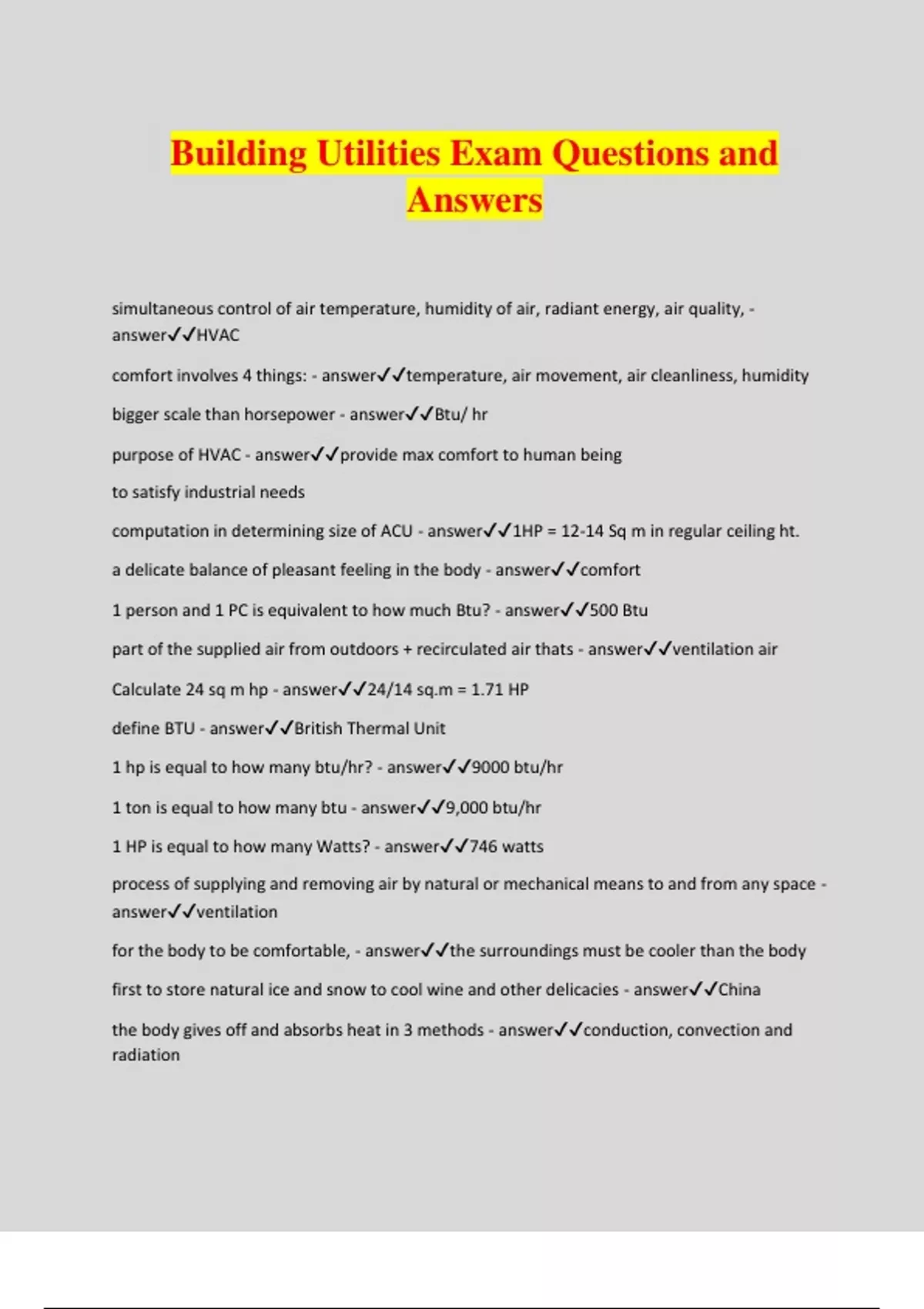 Building Utilities Exam Questions and Answers simultaneous control of air temperature, humidity of air, radiant energy, air quality, - answerHVAC comfort involves 4 things: - answertemperature, air movement, air cleanliness, humidity bigger scale than horsepower - answerBtu/ hr purpose of HVAC - answerprovide max comfort to human being to satisfy industrial needs computation in determining size of ACU - answer1HP = 12-14 Sq m in regular ceiling ht. a delicate balance of pleasant feeling in the body - answercomfort 1 person and 1 PC is equivalent to how much Btu? - answer500 Btu part of the supplied air from outdoors + recirculated air thats - answerventilation air Calculate 24 sq m hp - answer24/14 sq.m = 1.71 HP define BTU - answerBritish Thermal Unit 1 hp is equal to how many btu/hr? - answer9000 btu/hr 1 ton is equal to how many btu - answer9,000 btu/hr 1 HP is equal to how many Watts? - answer746 watts process of supplying and removing air by natural or mechanical means to and from any space - answerventilation for the body to be comfortable, - answerthe surroundings must be cooler than the body first to store natural ice and snow to cool wine and other delicacies - answerChina the body gives off and absorbs heat in 3 methods - answerconduction, convection and radiation