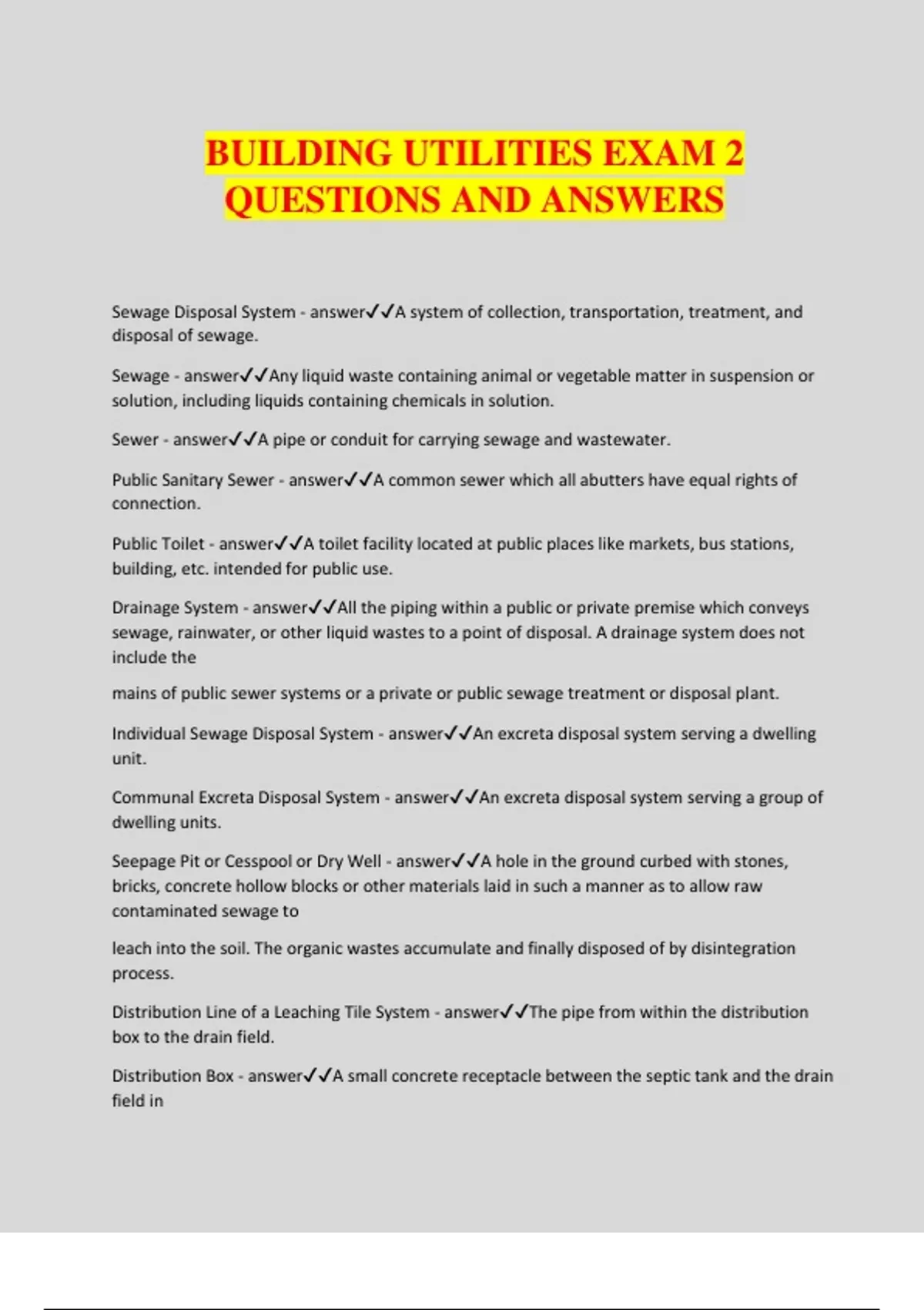 BUILDING UTILITIES EXAM 2 QUESTIONS AND ANSWERS Sewage Disposal System - answerA system of collection, transportation, treatment, and disposal of sewage. Sewage - answerAny liquid waste containing animal or vegetable matter in suspension or solution, including liquids containing chemicals in solution. Sewer - answerA pipe or conduit for carrying sewage and wastewater. Public Sanitary Sewer - answerA common sewer which all abutters have equal rights of connection. Public Toilet - answerA toilet facility located at public places like markets, bus stations, building, etc. intended for public use. Drainage System - answerAll the piping within a public or private premise which conveys sewage, rainwater, or other liquid wastes to a point of disposal. A drainage system does not include the mains of public sewer systems or a private or public sewage treatment or disposal plant. Individual Sewage Disposal System - answerAn excreta disposal system serving a dwelling unit. Communal Excreta Disposal System - answerAn excreta disposal system serving a group of dwelling units