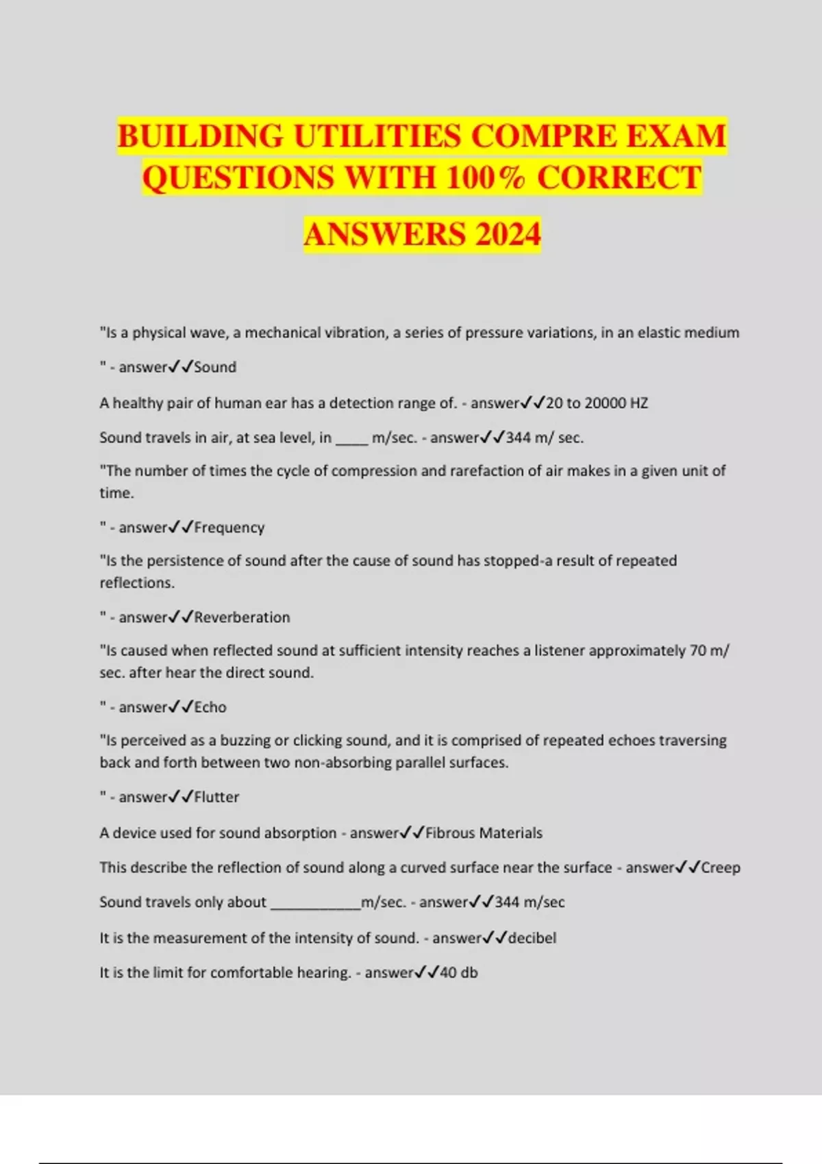 BUILDING UTILITIES COMPRE EXAM QUESTIONS WITH 100% CORRECT ANSWERS 2024 "Is a physical wave, a mechanical vibration, a series of pressure variations, in an elastic medium " - answerSound A healthy pair of human ear has a detection range of. - answer20 to 20000 HZ Sound travels in air, at sea level, in ____ m/sec. - answer344 m/ sec. "The number of times the cycle of compression and rarefaction of air makes in a given unit of time. " - answerFrequency "Is the persistence of sound after the cause of sound has stopped-a result of repeated reflections. " - answerReverberation "Is caused when reflected sound at sufficient intensity reaches a listener approximately 70 m/ sec. after hear the direct sound. " - answerEcho "Is perceived as a buzzing or clicking sound, and it is comprised of repeated echoes traversing back and forth between two non-absorbing parallel surfaces. " - answerFlutter A device used for sound absorption - answerFibrous Materials This describe the reflection of sound along a curved surface near the surface - answerCreep Sound travels only about ___________m/sec. - answer344 m/sec It is the measurement of the intensity of sound. - answerdecibel It is the limit for comfortable hearing. - answer40 db "It is the time in seconds that a reflected sound diminishes for the case by 60db after the original sound has stopped." - answerReverberation time "It is a type of microphone which equally sensitive sound arriving at it from any direction" - answeromnidirectional mic "It has a stimulating effect, conducive to drinking, induces sleep, best for bars and night club." - answerincandescent "In theory and fundamentals of lighting. It is the science that deals with measurement of light." - answerphotometry "It refers to the unit of intensity of light of one standard candle whose light is concentrated at a point and the light source is assumed to be placed at the center of a hollow sphere of one foot radius." - answercandle power "In physical principles of light, it is the light rays leaving the source strike through, opaque surface which spreads the light in various directions, in addition light is broken up while in reflection, the light bounces back at a different direction." - answerDiffusion "It is the unit of luminous flux, amount f light falling on a surface from the source." - answerLumen "Mho as used in electrical systems calculation is defined as _______." - answerthe reciprocal of ohm "A unit of mechanical power is horsepower. What is electrical power?" - answerWatt "In lighting and illumination calculation, what is the unit for lux?" - answer1 lumen per sq.m. "In Inverse Square Law, it states that: "sound intensity ______ the square of the distance from the source."" - answerVaries inversely with "Is a logarithmic unit of measurement that expresses the magnitude of a physical quantity (usually power or intensity) relative to a specified or implied reference level." - answerDecibel "An apparent shift in the frequency occurring when an acoustic source and listener are in motion relative to each other, the frequency increasing when the source and the listener approach each other and decreasing when they move apart" - answerdroppler effect What is a repetitious reflective sound due to parallel walls? - answerflutter - delayed sound heard a fraction of a second after the direction of sound isheard - answerEcho unpleasant or unwanted sound - answerNoise What is the study of reactions of humans to audible sound? - answerpsycho acoustics study of effects on environment upon audible sound - answerenvironmental acoustics - study of sound generated by equipment - answerelectro acoustics What is the distance between two similar points in succession waves traveling in one cycle? - answerwavelength rate of repetition of a periodic phenomenon - answerfrequency - "a sensation felt by the brain resulting from the distance of molecules in the air" - answersound - What is the amount of sound energy produced by the source? - answermagnitude unit of loudness of sound - answerdecibel at speed of sound normal temperature and pressure - answervelocity - What is the reflected sound that gathers in a central portion of the room? - answersound foci one characterized by large amounts of absorption - answerdead room