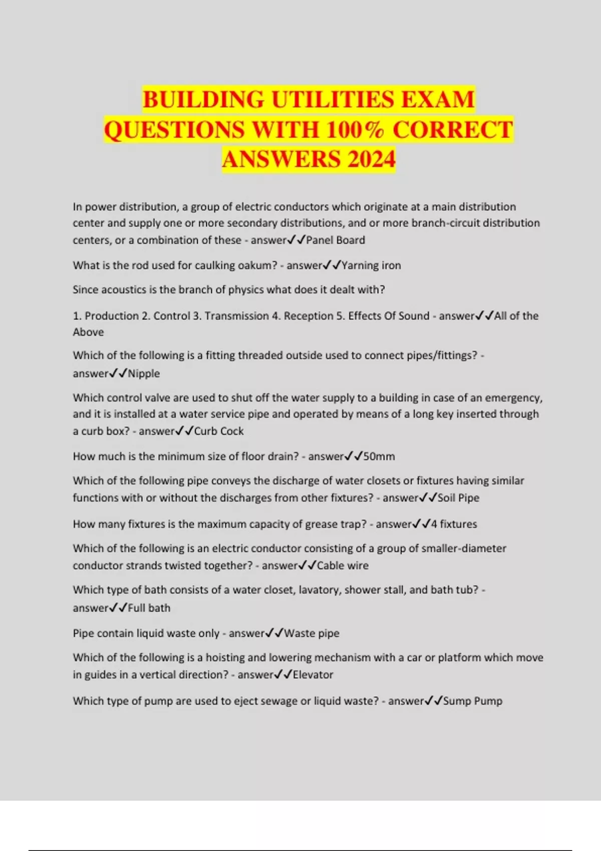 BUILDING UTILITIES EXAM QUESTIONS WITH 100% CORRECT ANSWERS 2024 In power distribution, a group of electric conductors which originate at a main distribution center and supply one or more secondary distributions, and or more branch-circuit distribution centers, or a combination of these - answerPanel Board What is the rod used for caulking oakum? - answerYarning iron Since acoustics is the branch of physics what does it dealt with? 1. Production 2. Control 3. Transmission 4. Reception 5. Effects Of Sound - answerAll of the Above Which of the following is a fitting threaded outside used to connect pipes/fittings? - answerNipple Which control valve are used to shut off the water supply to a building in case of an emergency, and it is installed at a water service pipe and operated by means of a long key inserted through a curb box? - answerCurb Cock How much is the minimum size of floor drain? - answer50mm Which of the following pipe conveys the discharge of water closets or fixtures having similar functions with or without the discharges from other fixtures? - answerSoil Pipe How many fixtures is the maximum capacity of grease trap? - answer4 fixtures Which of the following is an electric conductor consisting of a group of smaller-diameter conductor strands twisted together? - answerCable wire Which type of bath consists of a water closet, lavatory, shower stall, and bath tub? - answerFull bath Pipe contain liquid waste only - answerWaste pipe Which of the following is a hoisting and lowering mechanism with a car or platform which move in guides in a vertical direction? - answerElevator Which type of pump are used to eject sewage or liquid waste? - answerSump Pump