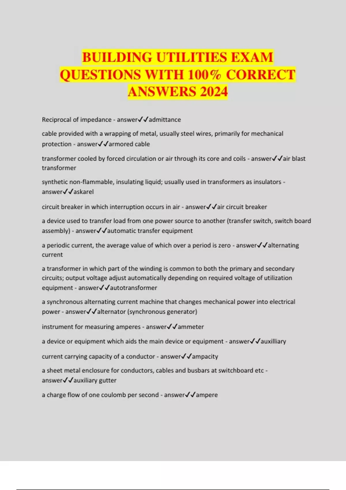 BUILDING UTILITIES EXAM QUESTIONS WITH 100% CORRECT ANSWERS 2024 Reciprocal of impedance - answeradmittance cable provided with a wrapping of metal, usually steel wires, primarily for mechanical protection - answerarmored cable transformer cooled by forced circulation or air through its core and coils - answerair blast transformer synthetic non-flammable, insulating liquid; usually used in transformers as insulators - answeraskarel circuit breaker in which interruption occurs in air - answerair circuit breaker a device used to transfer load from one power source to another (transfer switch, switch board assembly) - answerautomatic transfer equipment a periodic current, the average value of which over a period is zero - answeralternating current a transformer in which part of the winding is common to both the primary and secondary circuits; output voltage adjust automatically depending on required voltage of utilization equipment - answerautotransformer a synchronous alternating current machine that changes mechanical power into electrical power - answeralternator (synchronous generator) instrument for measuring amperes - answerammeter a device or equipment which aids the main device or equipment - answerauxilliary current carrying capacity of a conductor - answerampacity a sheet metal enclosure for conductors, cables and busbars at switchboard etc - answerauxiliary gutter a charge flow of one coulomb per second - answerampere