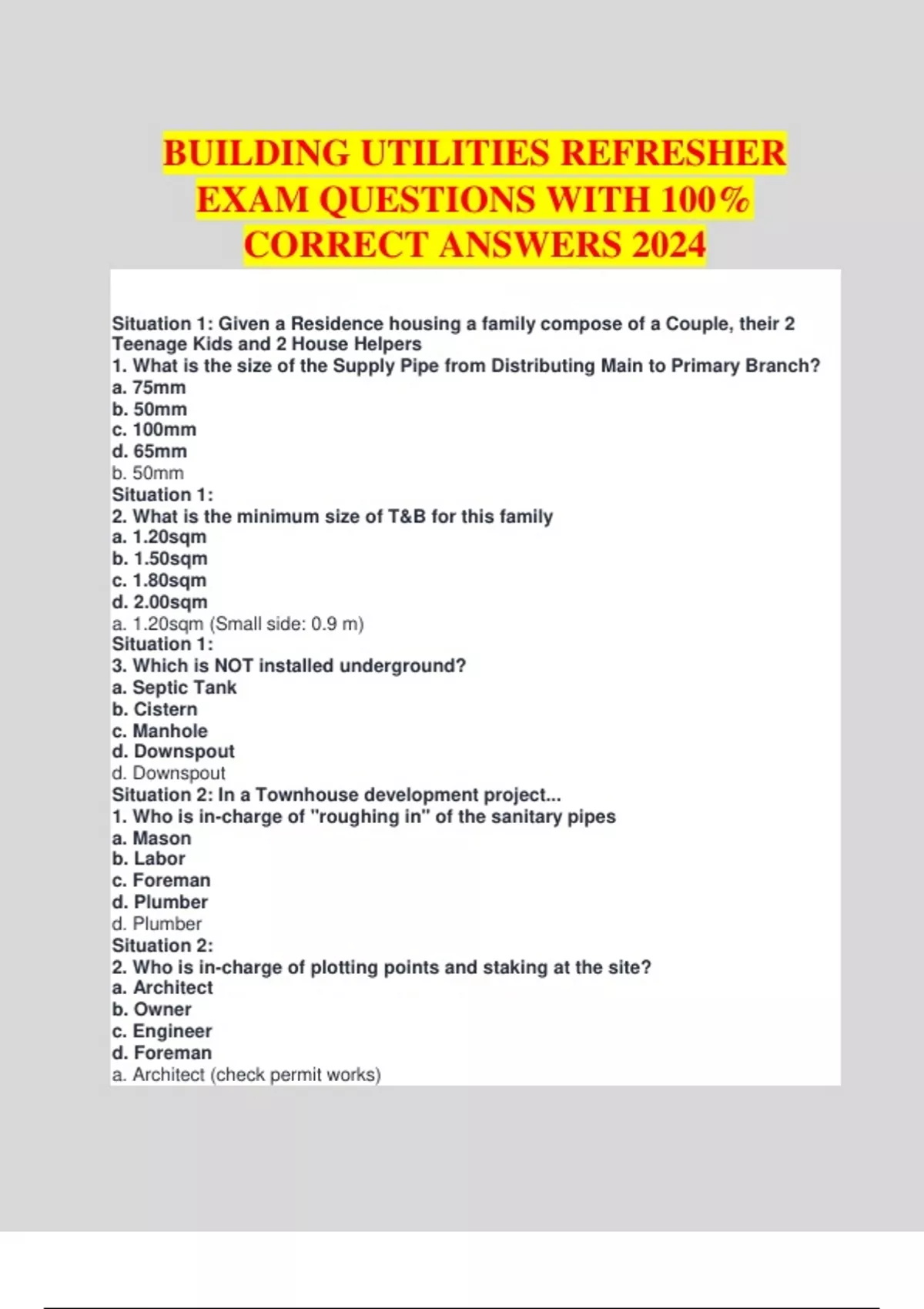 BUILDING UTILITIES REFRESHER EXAM QUESTIONS WITH 100% CORRECT ANSWERS 2024 Situation 1: Given a Residence housing a family compose of a Couple, their 2 Teenage Kids and 2 House Helpers 1. What is the size of the Supply Pipe from Distributing Main to Primary Branch? a. 75mm b. 50mm c. 100mm d. 65mm b. 50mm Situation 1: 2. What is the minimum size of T&B for this family a. 1.20sqm b. 1.50sqm c. 1.80sqm d. 2.00sqm a. 1.20sqm (Small side: 0.9 m) Situation 1: 3. Which is NOT installed underground? a. Septic Tank b. Cistern c. Manhole d. Downspout d. Downspout Situation 2: In a Townhouse development project... 1. Who is in-charge of "roughing in" of the sanitary pipes a. Mason b. Labor c. Foreman d. Plumber d. Plumber Situation 2: 2. Who is in-charge of plotting points and staking at the site? a. Architect b. Owner c. Engineer d. Foreman a. Architect (check permit works) Situation 2: 3. Which is an illegal thing to do... a. Booster pump directly getting water directly from water main then distributed to the Townhouse units b. Tap directly from water main then directly to the fixture units c. Provide a cistern then provide water to the townhouse units d. a. Booster pump directly getting water directly from water main then distributed to the Townhouse units Situation 2: 4. Where would you least place a PVC Pipe? a. Under the carport b. Underneath a tree c. d. b. Underneath a tree Situation 2: 5. Which of the following lamps has the filament? a. Incandescent b. LED c. Fluorescent d. a. Incandescent Situation 3: You were tasked to design a call center office. The manager specifically told you that he wanted to keep a close watch on his staff. 1. Modular cubicles are installed in the office. How many outlets per cubicle would you recommend if the office uses UPS? a. 0 b. 1 c. 2 d. 3 c. 2 Uninterruptible Power Supply (UPS) Power Distribution Unit (PDU) Note: Verify Answer! (b. 1) ? Situation 3: 2. What type of wall for the cubicles would you recommend taking into consideration acoustics and the manager's instruction for visual acuity? a. low wall modular partition with glass strips at the middle b. glass c. dry wall partition d. CHB a. low wall modular partition with glass strips at the middle Situation 3: 3. What type of device will you use to amplify the wifi connection coming from the main server? a. LAN b. Router c. PABX d. CCTV b. Router 4. What would you install if the manager wants a local connection as well as an outside line? a. LAN c. PABX b. Router d. CCTV c. PABX (Private automatic branch exchange) 5. What type of local data sharing device is appropriate for the office? a. LAN c. PABX b. Router d. CCTV a. LAN 6. What type of device should be installed for surveillance? a. LAN b. Router c. PABX d. CCTV d. CCTV Situation 4: Given a Water Supply Plan & Isometric Layout of Ground Floor & Second Floor... 1. Locate the Angle Valve Angle Valve - 90 deg. turn Used for Lavatory, Kitchen, W.C, etc. 2. Where is the highest pressure? a. 2nd Floor b. Underground c. Ground Floor d. At the Vertical Pipe b. Underground 3. What Fitting is used when there is a change in direction? 90 deg. Elbow or 1/4 Bend Situation 5: In a convenience store... questions regarding air-conditioning system... 1.How many tonners will you use (several choices are given) the required is 12- 13tons based on computations... a. 1 10-tonner b. Three 4-tonners c. Two 3-tonner plus one 4-tonner d. c. Two 3-tonner plus one 4-tonner Solution: (Area of room x 25BTU) 2. What will you provide in the entrance door to control air from coming in and out a. Air Curtain b. Exhaust Fan c. Dehumidifier d. a. Air Curtain 3. Where will you locate the ACCU of the convenience store? a. on the ceiling c. in front of the store b. outside the store d. b. outside the store 4. Which is not needed in the said system? a. ACCU c. AHU b. FHU d. Condenser Drain Pipe b. FHU Note: ACCU - Outside AHU - Inside Split Type (Condenser Drain Pipe) - 3m max. length, copper tube Situation 6: a home theatre is to be renovated... 1. What will you use on the walls to minimize sound transmission. a. CHB c. b. Gypsum Board on studs d. b. Gypsum Board on studs 2. What part of the wall will you cover? a. Upper panel c. Edges of the Door b. Lower Panel d. Face of the Door c. Edges of the Door (Rubber Seal) 3. What inexpensive yet effective wall treatment will you suggest? a. Sawali b. Egg crate