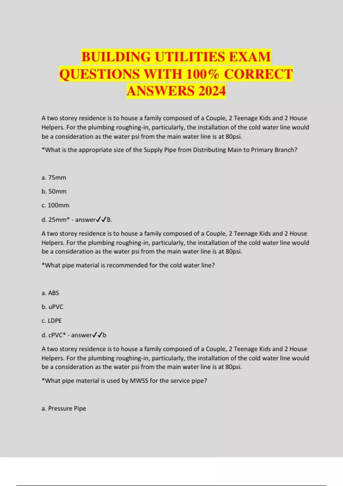 BUILDING UTILITIES EXAM QUESTIONS WITH 100% CORRECT ANSWERS 2024 A two storey residence is to house a family composed of a Couple, 2 Teenage Kids and 2 House Helpers. For the plumbing roughing-in, particularly, the installation of the cold water line would be a consideration as the water psi from the main water line is at 80psi. *What is the appropriate size of the Supply Pipe from Distributing Main to Primary Branch? a. 75mm b. 50mm c. 100mm d. 25mm* - answerB. A two storey residence is to house a family composed of a Couple, 2 Teenage Kids and 2 House Helpers. For the plumbing roughing-in, particularly, the installation of the cold water line would be a consideration as the water psi from the main water line is at 80psi. *What pipe material is recommended for the cold water line? a. ABS b. uPVC c. LDPE d. cPVC* - answerb A two storey residence is to house a family composed of a Couple, 2 Teenage Kids and 2 House Helpers. For the plumbing roughing-in, particularly, the installation of the cold water line would be a consideration as the water psi from the main water line is at 80psi. *What pipe material is used by MWSS for the service pipe? a. Pressure Pipe b. PVC c. ABS d. HDPE* - answerc A two storey residence is to house a family composed of a Couple, 2 Teenage Kids and 2 House Helpers. For the plumbing roughing-in, particularly, the installation of the cold water line would be a consideration as the water psi from the main water line is at 80psi. *What is the minimum size of T&B for this family? a. 1.20sqm b. 2.50sqm c. 2.16sqm d. 3.00sqm* - answera A two storey residence is to house a family composed of a Couple, 2 Teenage Kids and 2 House Helpers. For the plumbing roughing-in, particularly, the installation of the cold water line would be a consideration as the water psi from the main water line is at 80psi. *What is the recommended size for the ¾ T&B for the kids? a. 1.20sqm b. 2.50sqm c. 2.16sqm d. 3.00sqm* - answerc A two storey residence is to house a family composed of a Couple, 2 Teenage Kids and 2 House Helpers. For the plumbing roughing-in, particularly, the installation of the cold water line would be a consideration as the water psi from the main water line is at 80psi. *What is the recommended size for the full T&B for the couple? a. 1.20sqm b. 2.50sqm c. 1.80sqm d. 3.00sqm* - answerd A two storey residence is to house a family composed of a Couple, 2 Teenage Kids and 2 House Helpers. For the plumbing roughing-in, particularly, the installation of the cold water line would be a consideration as the water psi from the main water line is at 80psi. *For the fixtures, what type of water closet is appropriate? a. Siphon Vortex b. Washdown c. Blowout d. Latrine* - answera A two storey residence is to house a family composed of a Couple, 2 Teenage Kids and 2 House Helpers. For the plumbing roughing-in, particularly, the installation of the cold water line would be a consideration as the water psi from the main water line is at 80psi. *Which of the following fixtures does NOT have water saving feature? a. Dual Flush Water Closet b. Waterless Urinal c. Self-closing faucet d. 1.5 gpf water closet* - answerd A two storey residence is to house a family composed of a Couple, 2 Teenage Kids and 2 House Helpers. For the plumbing roughing-in, particularly, the installation of the cold water line would be a consideration as the water psi from the main water line is at 80psi. * If hot water is to be introduced, what plumbing appliance is applicable? a. Gas Furnace b. Steam c. Electric Heater d. Solar Water Heater * - answerc A two storey residence is to house a family composed of a Couple, 2 Teenage Kids and 2 House Helpers. For the plumbing roughing-in, particularly, the installation of the cold water line would be a consideration as the water psi from the main water line is at 80psi. *What pipe material is best applied for hot water use? a. cPVC b. 1.50 sqm c. LDPE d. Copper* - answera A two storey residence is to house a family composed of a Couple, 2 Teenage Kids and 2 House Helpers. For the plumbing roughing-in, particularly, the installation of the cold water line would be a consideration as the water psi from the main water line is at 80psi. *Which is NOT installed underground?* a. septic tank b. cistern c. manhole d. downspout - answerd A two storey residence is to house a family composed of a Couple, 2 Teenage Kids and 2 House Helpers. For the plumbing roughing-in, particularly, the installation of the cold water line would be a consideration as the water psi from the main water line is at 80psi. *What is the fixture unit of a water closet? a. 3 b. 4 c. 6 d. 2* - answerc A two storey residence is to house a family composed of a Couple, 2 Teenage Kids and 2 House Helpers. For the plumbing roughing-in, particularly, the installation of the cold water line would be a consideration as the water psi from the main water line is at 80psi.