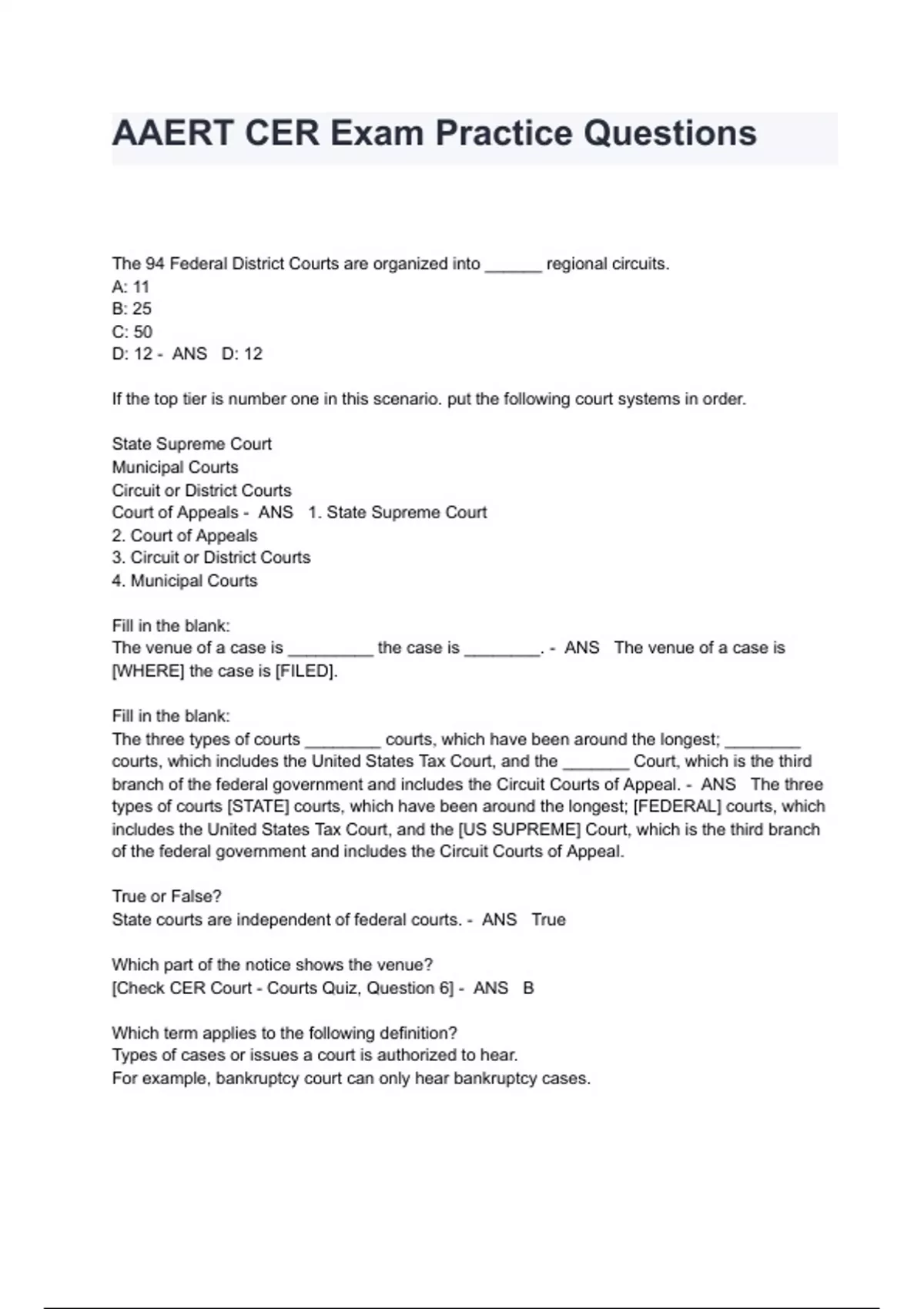 AAERT CER Exam Practice Questions And Answers All Verified The 94 Federal District Courts are organized into ______ regional circuits. A: 11 B: 25 C: 50 D: 12 - ANS D: 12 If the top tier is number one in this scenario. put the following court systems in order. State Supreme Court Municipal Courts Circuit or District Courts Court of Appeals - ANS 1. State Supreme Court 2. Court of Appeals 3. Circuit or District Courts 4. Municipal Courts Fill in the blank: The venue of a case is _________ the case is ________. - ANS The venue of a case is [WHERE] the case is [FILED]. Fill in the blank: The three types of courts ________ courts, which have been around the longest; ________ courts, which includes the United States Tax Court, and the _______ Court, which is the third branch of the federal government and includes the Circuit Courts of Appeal. - ANS The three types of courts [STATE] courts, which have been around the longest; [FEDERAL] courts, which includes the United States Tax Court, and the [US SUPREME] Court, which is the third branch of the federal government and includes the Circuit Courts of Appeal. True or False? State courts are independent of federal courts. - ANS True Which part of the notice shows the venue? [Check CER Court - Courts Quiz, Question 6] - ANS B Which term applies to the following definition? Types of cases or issues a court is authorized to hear. For example, bankruptcy court can only hear bankruptcy cases. A: Jurisdiction - subject matter B: Jurisdiction - geographic C: Jurisdiction - limited D: Jurisdiction - general - ANS A: Jurisdiction - subject matter AAERT standards are based on.... A: federal rules. B: live free and be free. C: independent thoughts. D: state rules. - ANS A: federal rules. True or False? When the U.S. Supreme Court rules on a matter, all other courts now have to follow that. - ANS True Constitutionality is decided by which court? A: Appeals B: Supreme