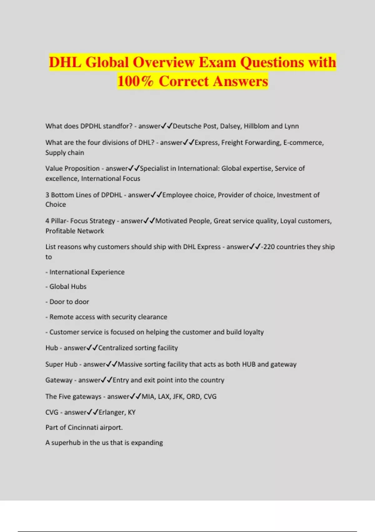 DHL Global Overview Exam Questions with 100% Correct Answers What does DPDHL standfor? - answerDeutsche Post, Dalsey, Hillblom and Lynn What are the four divisions of DHL? - answerExpress, Freight Forwarding, E-commerce, Supply chain Value Proposition - answerSpecialist in International: Global expertise, Service of excellence, International Focus 3 Bottom Lines of DPDHL - answerEmployee choice, Provider of choice, Investment of Choice 4 Pillar- Focus Strategy - answerMotivated People, Great service quality, Loyal customers, Profitable Network List reasons why customers should ship with DHL Express - answer-220 countries they ship to - International Experience - Global Hubs - Door to door - Remote access with security clearance - Customer service is focused on helping the customer and build loyalty Hub - answerCentralized sorting facility Super Hub - answerMassive sorting facility that acts as both HUB and gateway Gateway - answerEntry and exit point into the country The Five gateways - answerMIA, LAX, JFK, ORD, CVG CVG - answerErlanger, KY Part of Cincinnati airport. A superhub in the us that is expanding