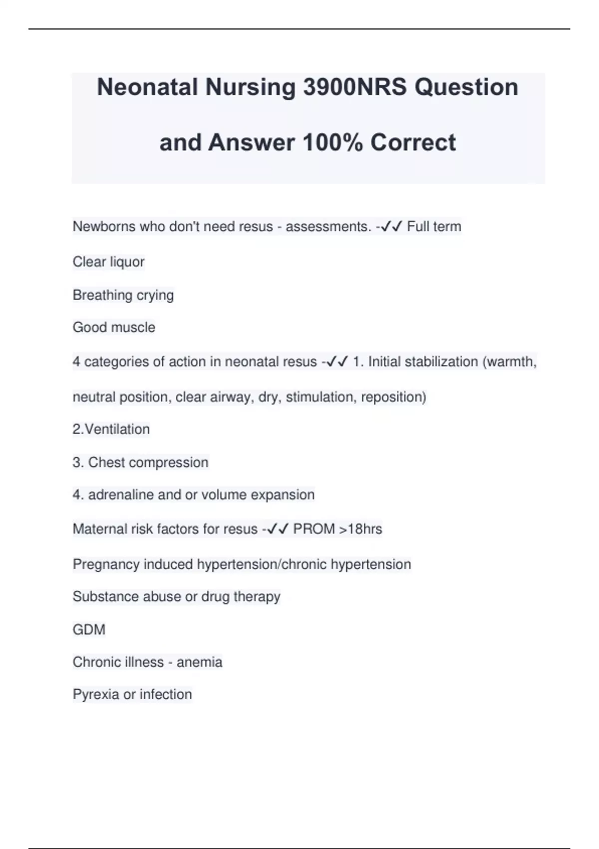Neonatal Nursing 3900NRS Question and Answer 100% Correct Newborns who don't need resus - assessments. - Full term Clear liquor Breathing crying Good muscle 4 categories of action in neonatal resus - 1. Initial stabilization (warmth, neutral position, clear airway, dry, stimulation, reposition) 2.Ventilation 3. Chest compression 4. adrenaline and or volume expansion Maternal risk factors for resus - PROM >18hrs Pregnancy induced hypertension/chronic hypertension Substance abuse or drug therapy GDM Chronic illness - anemia Pyrexia or infection