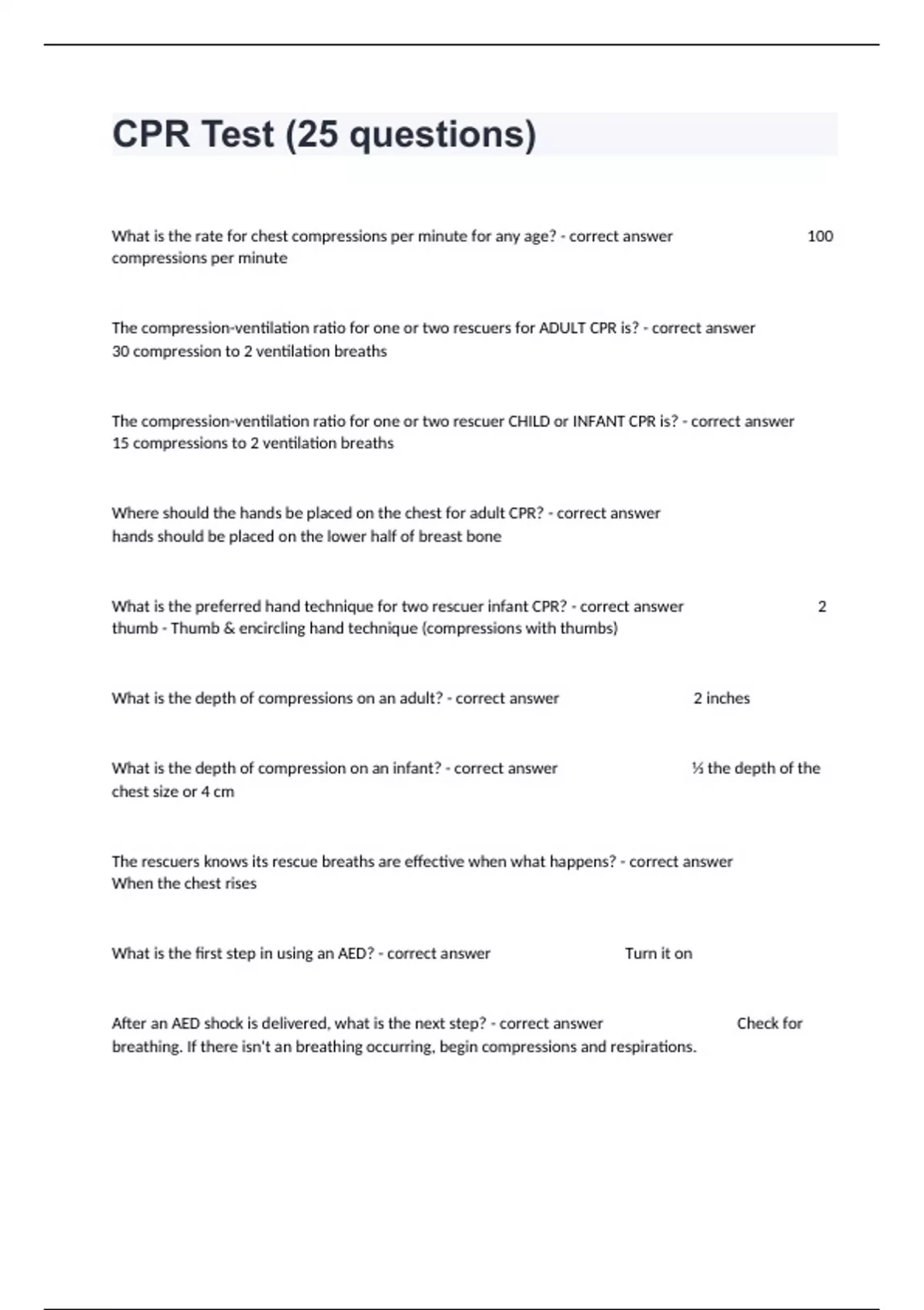 What is the rate for chest compressions per minute for any age? - correct answer 100 compressions per minute The compression-ventilation ratio for one or two rescuers for ADULT CPR is? - correct answer 30 compression to 2 ventilation breaths The compression-ventilation ratio for one or two rescuer CHILD or INFANT CPR is? - correct answer 15 compressions to 2 ventilation breaths Where should the hands be placed on the chest for adult CPR? - correct answer hands should be placed on the lower half of breast bone What is the preferred hand technique for two rescuer infant CPR? - correct answer 2 thumb - Thumb & encircling hand technique (compressions with thumbs) What is the depth of compressions on an adult? - correct answer 2 inches What is the depth of compression on an infant? - correct answer ⅓ the depth of the chest size or 4 cm The rescuers knows its rescue breaths are effective when what happens? - correct answer When the chest rises What is the first step in using an AED? - correct answer Turn it on After an AED shock is delivered, what is the next step? - correct answer Check for breathing. If there isn't an breathing occurring, begin compressions and respirations. Why is high quality CPR and compressions necessary? - correct answer High quality CPR is necessary because is provides adequate blood flow and oxygen circulation throughout the body when done correctly. When is scene safety assessed? - correct answer When you first arrive at the scene Interruptions to CPR should take more than ___ seconds. - correct answer 10 Chest compressions should be initiated within ___ seconds if identifying victim is not responsive and has no pulse. - correct answer 10 In two rescuer CPR, the first rescuer starts ___________ _________________ while the seconds rescuers ____________ _ _ _. - correct answer starts chest compressions; call 911. (or activated AED and/or provides help with airway) If a choking victim becomes unresponsive, the rescuer should first call for help (or EMS) and begin _____. - correct answer CPR Rescue breaths for a CHILD or INFANT should be one breath every ________________. - correct answer 3-5 seconds Rescue breaths for an ADULT should be one breath every ____________. - correct answer 5-6 seconds How do you relive choking in an INFANT? - correct answer 5 back slaps, 5 chest thrusts How do you relieve choking in an ADULT? - correct answer abdominal chest thrust (Heimlich maneuver) If any choking victim goes unresponsive, what additional step do you perform before breathing? - correct answer CPR, look, and remove if there is anything visible in the back of the victims airway