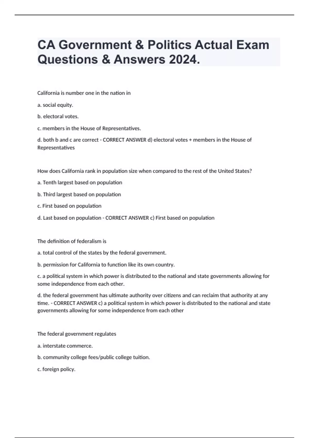 CA Government & Politics Actual Exam Questions & Answers 2024. California is number one in the nation in a. social equity. b. electoral votes. c. members in the House of Representatives. d. both b and c are correct - CORRECT ANSWER d) electoral votes + members in the House of Representatives How does California rank in population size when compared to the rest of the United States? a. Tenth largest based on population b. Third largest based on population c. First based on population d. Last based on population - CORRECT ANSWER c) First based on population The definition of federalism is a. total control of the states by the federal government. b. permission for California to function like its own country. c. a political system in which power is distributed to the national and state governments allowing for some independence from each other. d. the federal government has ultimate authority over citizens and can reclaim that authority at any time. - CORRECT ANSWER c) a political system in which power is distributed to the national and state governments allowing for some independence from each other The federal government regulates a. interstate commerce. b. community college fees/public college tuition. c. foreign policy. d. Both A and D are correct. - CORRECT ANSWER d) interstate commerce The state determines the grounds for a. divorce. b. defense spending. c. immigration law. d. interstate commerce. - CORRECT ANSWER a) divorce Each Californian lives in several election jurisdictions, including a congressional district, a state Senate district, an assembly district, a county supervisorial district, plus a city and a school and/or community college district. - CORRECT ANSWER true