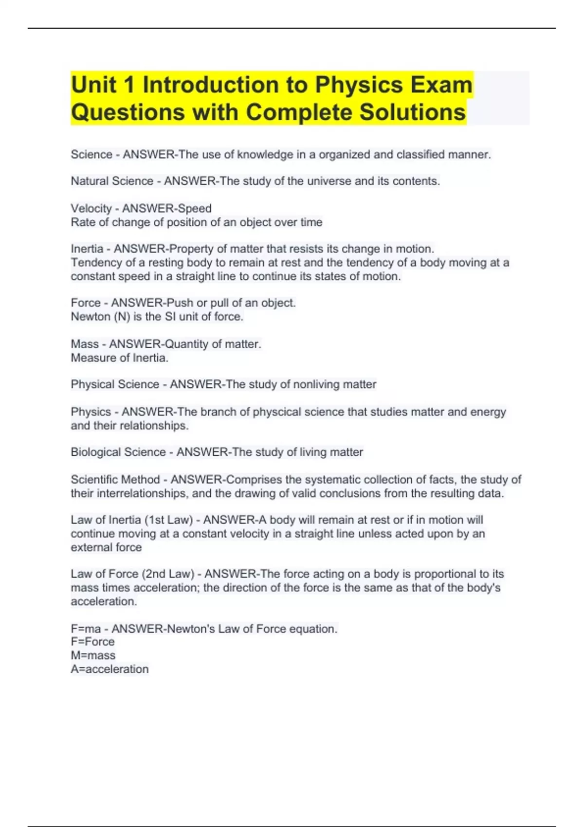 Science - ANSWER-The use of knowledge in a organized and classified manner. Natural Science - ANSWER-The study of the universe and its contents. Velocity - ANSWER-Speed Rate of change of position of an object over time Inertia - ANSWER-Property of matter that resists its change in motion. Tendency of a resting body to remain at rest and the tendency of a body moving at a constant speed in a straight line to continue its states of motion. Force - ANSWER-Push or pull of an object. Newton (N) is the SI unit of force. Mass - ANSWER-Quantity of matter. Measure of Inertia. Physical Science - ANSWER-The study of nonliving matter Physics - ANSWER-The branch of physcical science that studies matter and energy and their relationships. Biological Science - ANSWER-The study of living matter Scientific Method - ANSWER-Comprises the systematic collection of facts, the study of their interrelationships, and the drawing of valid conclusions from the resulting data. Law of Inertia (1st Law) - ANSWER-A body will remain at rest or if in motion will continue moving at a constant velocity in a straight line unless acted upon by an external force Law of Force (2nd Law) - ANSWER-The force acting on a body is proportional to its mass times acceleration; the direction of the force is the same as that of the body's acceleration. F=ma - ANSWER-Newton's Law of Force equation. F=Force M=mass A=acceleration