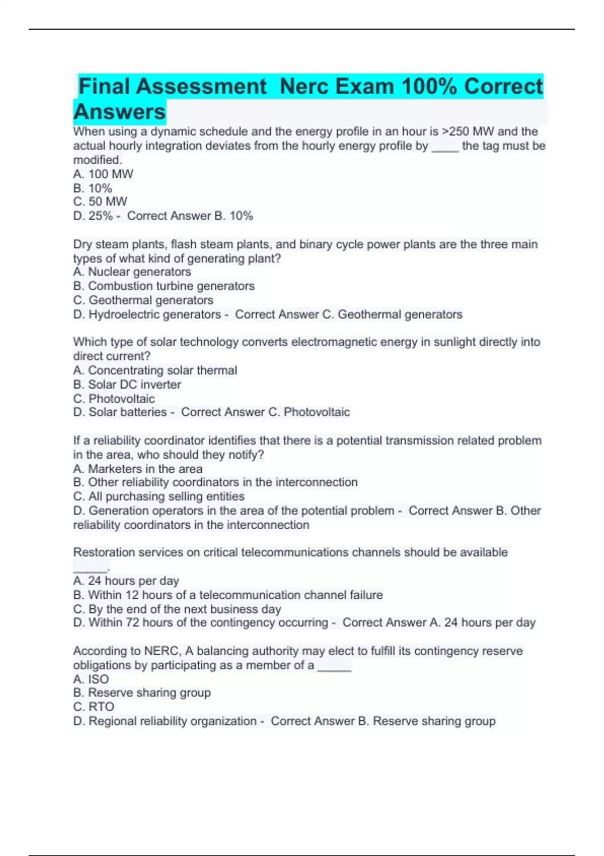 Final Assessment Nerc Exam 100% Correct Answers When using a dynamic schedule and the energy profile in an hour is 250 MW and the actual hourly integration deviates from the hourly energy profile by ____ the tag must be modified. A. 100 MW B. 10% C. 50 MW D. 25% - Correct Answer B. 10% Dry steam plants, flash steam plants, and binary cycle power plants are the three main types of what kind of generating plant? A. Nuclear generators B. Combustion turbine generators C. Geothermal generators D. Hydroelectric generators - Correct Answer C. Geothermal generators Which type of solar technology converts electromagnetic energy in sunlight directly into direct current? A. Concentrating solar thermal B. Solar DC inverter C. Photovoltaic D. Solar batteries - Correct Answer C. Photovoltaic If a reliability coordinator identifies that there is a potential transmission related problem in the area, who should they notify? A. Marketers in the area B. Other reliability coordinators in the interconnection C. All purchasing selling entities D. Generation operators in the area of the potential problem - Correct Answer B. Other reliability coordinators in the interconnection Restoration services on critical telecommunications channels should be available _____. A. 24 hours per day B. Within 12 hours of a telecommunication channel failure C. By the end of the next business day D. Within 72 hours of the contingency occurring - Correct Answer A. 24 hours per day According to NERC, A balancing authority may elect to fulfill its contingency reserve obligations by participating as a member of a _____ A. ISO B. Reserve sharing group C. RTO D. Regional reliability organization - Correct Answer B. Reserve sharing group If you were to experience the northern lights what would be your concern with the operation of the power system? A. System harmonics causing oscillations B. A reduction of MVAR consumption C. Generator output reduction D. Transformer overheating - Correct Answer D. Transformer overheating Your BA has a net scheduled interchange of 650 MW and your actual interchange is 800 MW. The frequency bias setting for your BA is 65 MW/0.1 Hz. There is a disturbance on the system and the actual frequency is 60.02 Hz. What is your ACE? A. -163 MW B. -137 MW C. 137 MW D. 163 MW - Correct Answer D. 163 MW Which of the following complies with the control performance 1 standard? A. CPS = 95% B. CPS = 125% C. CPS = 90% D. CPS = 80% - Correct Answer B. CPS = 125% Generators have the ability to be used as voltage control devices. If a generator raises its VAR output the system operator should expect the system voltage to A. Decrease B. Increase C. Not change D. Collapse - Correct Answer B. Increase if a BA has 500 MW of spinning reserves and of that 300 are regulating reserves, by definition, NERC requires the regulating reserves must be ____? A. Online and AGC responsive B. Able to ramp to full load within 10 minutes C. Able to be online within 10 minutes D. Able to be online within 5 minutes - Correct Answer A. Online and AGC responsive There is a shunt capacitor on your system that has a rating of 50 MVAR @ 138 KV. The voltage at the time of switching the capacitor in service is 124 KV. What would be the expected output of the capacitor? A. 45 MVAR B. 43.5 MVAR C. 50 MVAR D. 40.5 MVAR - Correct Answer D. 40.5 MVAR Which mode of AGC operation is the one that NERC states will be used unless such operation is adverse to the system or interconnection Reliability? A. Constant interchange B. Tie-line Bias C. Constant frequency D. Load-frequency bias - Correct Answer B. Tie-line Bias You have a 600 MW unit that is currently loaded at 300 MW and frequency drops .2 Hz. What will the new output of the generator be as a result of the drop in frequency due to droop characteristic? A. 300 MW B. 340 MW C. 260 MW D. 380 MW - Correct Answer B. 340 MW If a BA is unable to calculate its ACE for more than ____ it shall notify its RC. A. 15 minutes B. 60 minutes C. 30 minutes D. 20 minutes - Correct Answer C. 30 minutes The system frequency is currently 60.03 Hz. The Synchronized generating capacity is 3200 MW. The system load is currently 2200 MW. What is the maximum amount of load block that should be restored? A. 160 MW B. 220 MW C. 110 MW D. 320 MW - Correct Answer A. 160 MW A balancing authority has a bias setting of -150 MW. The frequency falls .05 Hz due to an external disturbance. How many MW would you expect this balancing authority area to provide to the disturbance? A. +150 MW B. +75 MW C. -150 MW D. -75 MW - Correct Answer B. +75 MW When a RC must curtail or hold an interchange transaction to respect transmission service reservation priorities or to mitigate potential or actual SOL violation, the RC shall inform the _____ listed on the interchange transaction tag of the greatest reliable level at which the affected interchange transaction may flow. A. Transmission service provider B. Transmission operator C. Source balancing authority D. Sink balancing authority - Correct Answer D. Sink balancing authority Each generator operator shall provide generator outage information daily for scheduled generator outages planned for the next day. Why is this important? A. So the RC & TOP can do their studies B. So marketing knows how much gas to buy C. So the BA knows how much power to buy D. So the plant can determine staffing requirements - Correct Answer A. So the RC & TOP can do their studies You are a TOP and you have changed relay settings for your UVLS scheme in the northern part of your system. Your neighbor just to the north of you has a major generating facility rated @ 1000 MW and they supply most of the MVAR for the area. They also monitor the MVAR flows on most of the lines in the area due to an NRC requirement regarding MVAR for a nuclear plant. Of the parties listed below, who does not need to be notified of the changes made to the relay settings A. Transmission service providers B. Balancing authorities C. Transmission oper