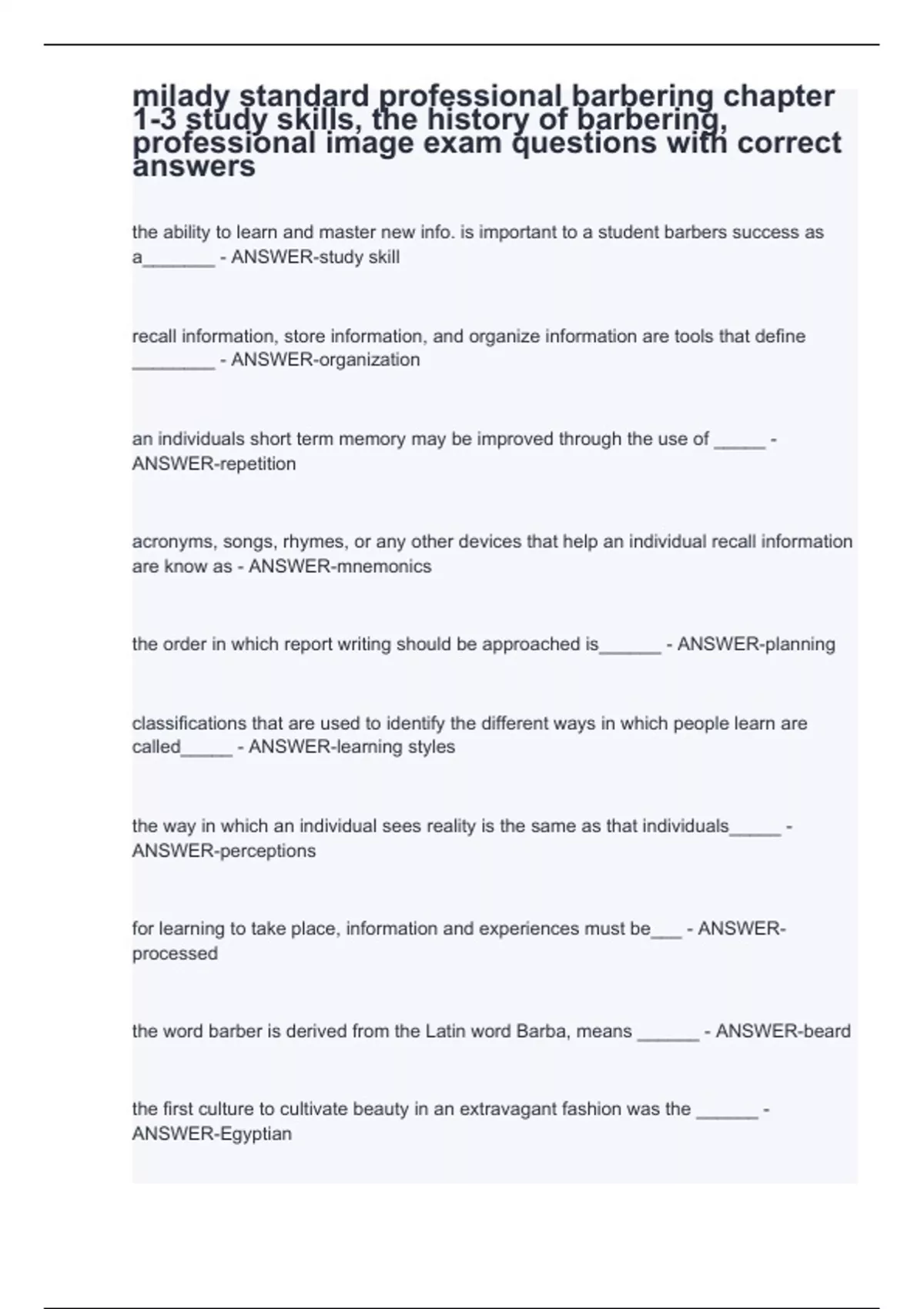 the ability to learn and master new info. is important to a student barbers success as a_______ - ANSWER-study skill recall information, store information, and organize information are tools that define ________ - ANSWER-organization an individuals short term memory may be improved through the use of _____ - ANSWER-repetition acronyms, songs, rhymes, or any other devices that help an individual recall information are know as - ANSWER-mnemonics the order in which report writing should be approached is______ - ANSWER-planning classifications that are used to identify the different ways in which people learn are called_____ - ANSWER-learning styles the way in which an individual sees reality is the same as that individuals_____ - ANSWER-perceptions for learning to take place, information and experiences must be___ - ANSWER-processed the word barber is derived from the Latin word Barba, means ______ - ANSWER-beard